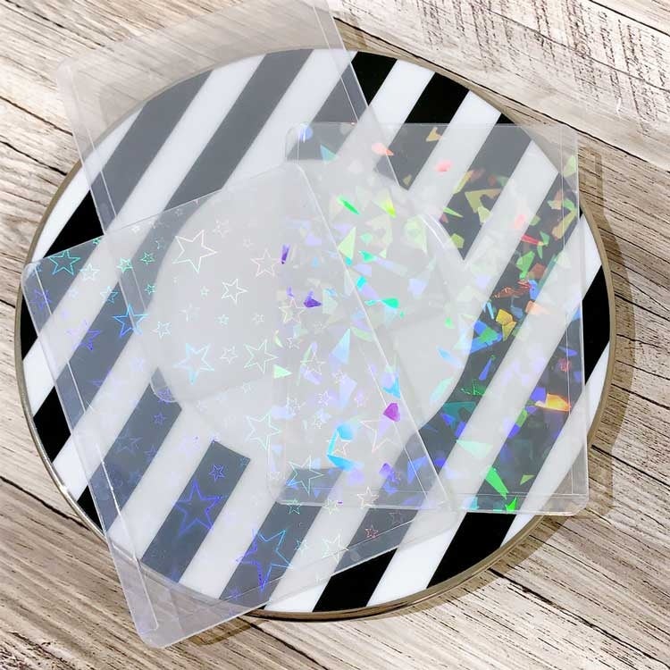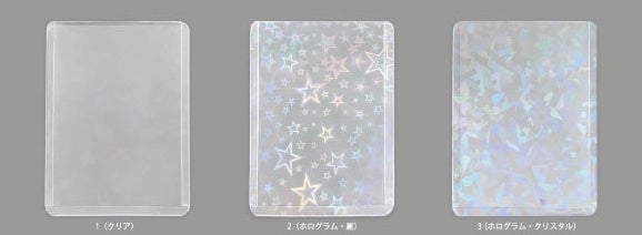 透明カードケースのほか、星柄やホログラム加工されたフィルムのついた三種類のケースは角度によってキラキラ輝きます。