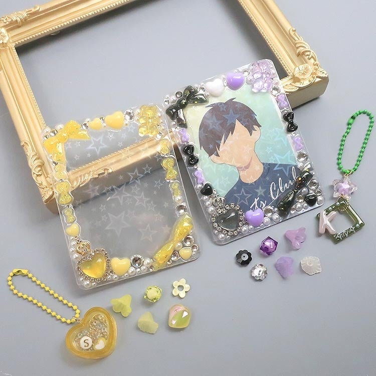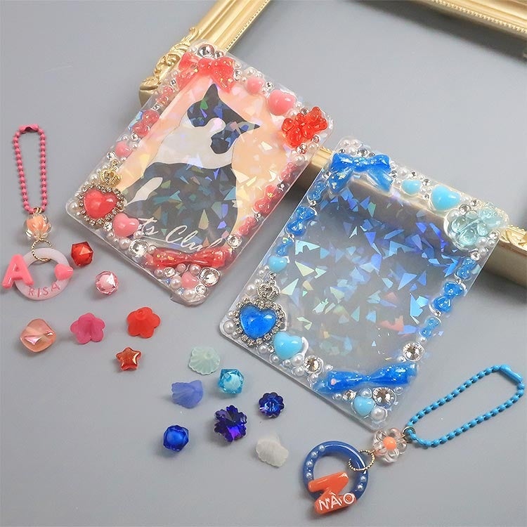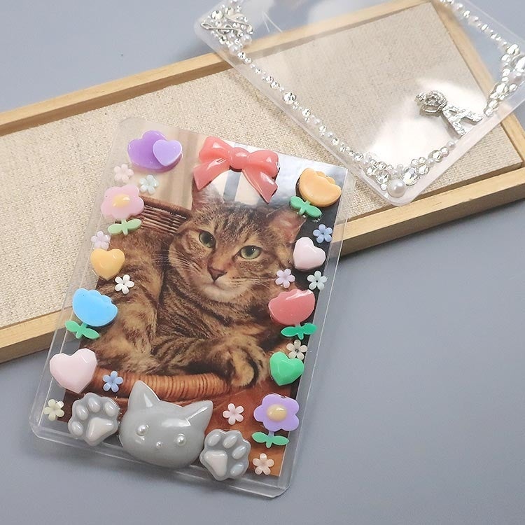 レジン、貼り付けパーツ、ビーズやラインストーンなどお気に入りのパーツをふんだんに使って、世界に一つだけのケースを作ることができます。 ご家族や、おうちのネコちゃんの写真を入れてデコレーションすることも楽しめます。