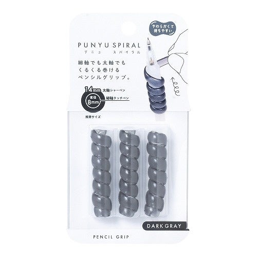 約 8mm の細いタッチペンや約 14mm 他色ボールペン等の細軸から太軸の筆記具 に取り付けることができるペンシルグリップ。プニプニとやわらかな感触のグリ ップを巻き付けることで、いつものペンや鉛筆が持ちやすく、疲れにくく、すべ りにくくなります。