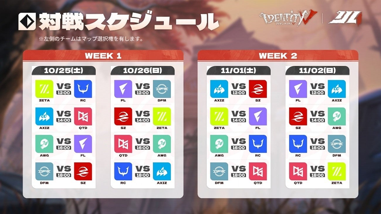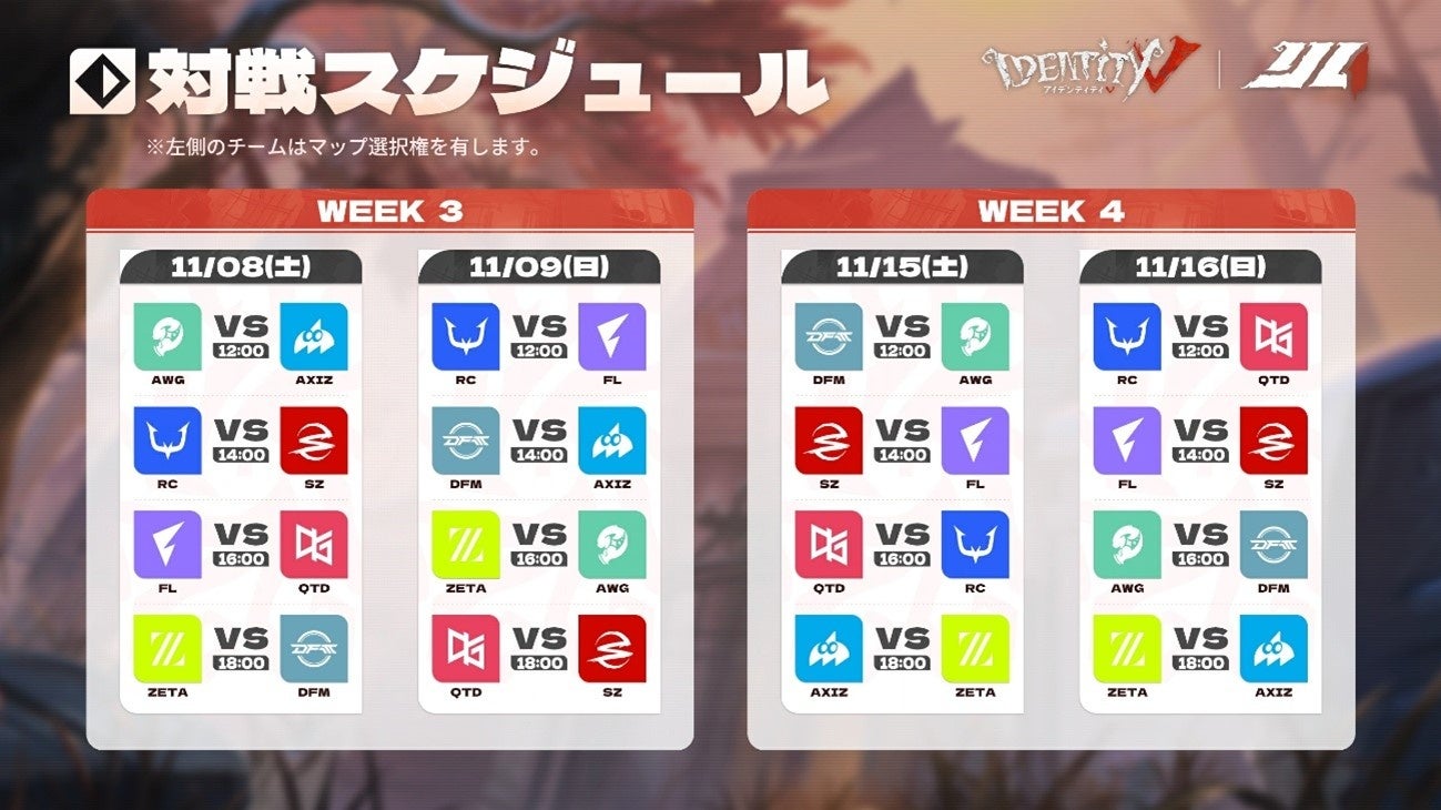 NetEase Gamesが開発・運営する非対称対戦型マルチゲーム『IdentityⅤ第五人格』。IVS招待大会の余韻を残しつつ、Identity V Japan League秋季大会が10月25日より開幕いたします!レギュラーシーズンは7週に渡りBO3形式で総当たり戦が行われ、上位6チームがプレイオフへと進出します。