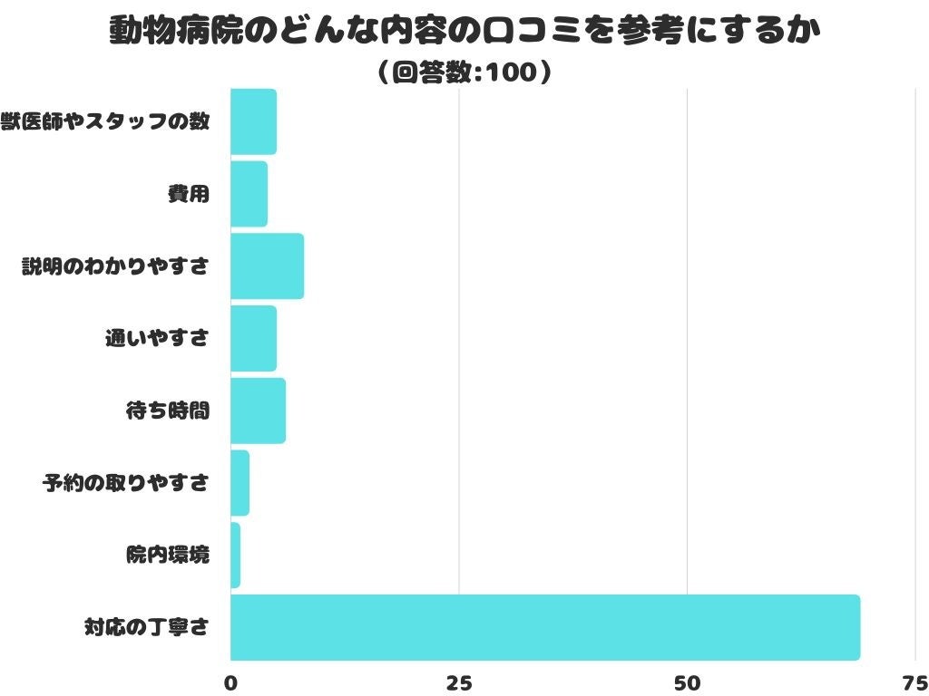 動物病院のどんな内容の口コミを参考にするかをアンケートにて調査したところ、1位は「対応の丁寧さ」でした。