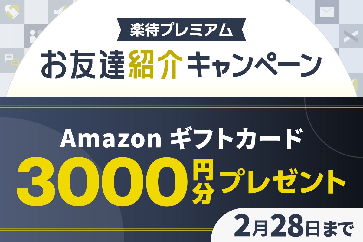 楽待株式会社(本社:東京都中央区、東証スタンダード、証券コード:6037)が運営する、国内最大の不動産投資プラットフォーム「楽待」(https://www.rakumachi.jp/)では、有料会員サービス「楽待プレミアム」において、お友達紹介キャンペーンを実施いたします。本キャンペーンでは、楽待プレミアムを紹介した方と、紹介を受けて新たに楽待プレミアムへご入会いただいた方の双方に、Amazonギフトカード3000円分をプレゼントします。