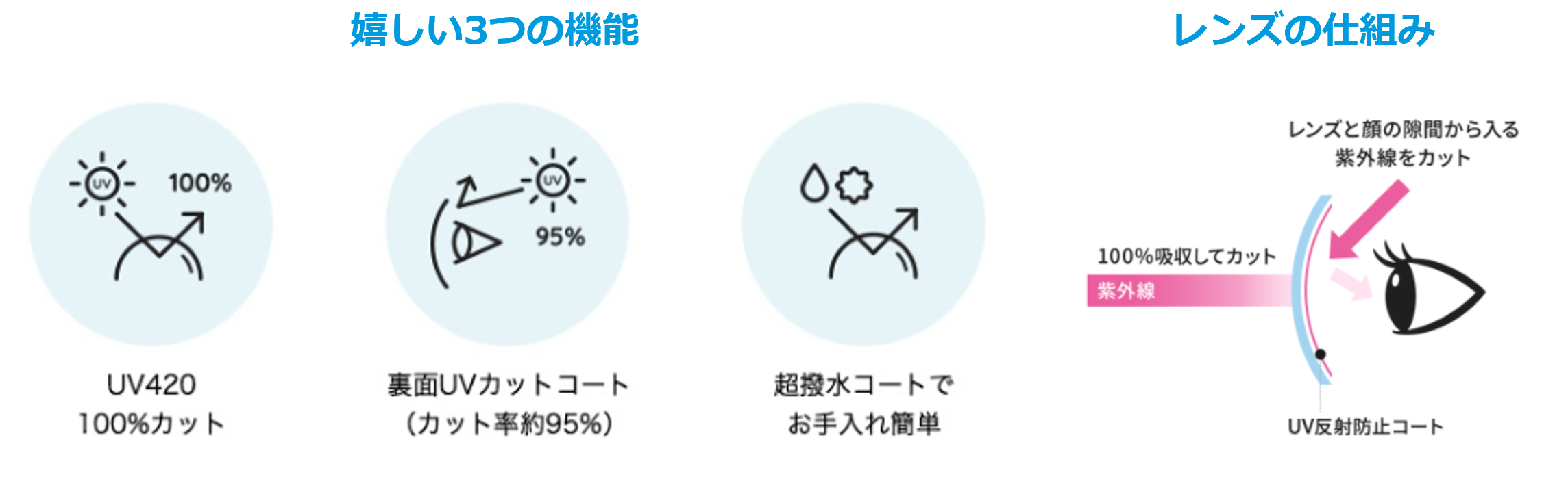 本フレームに搭載されている「Zoff UVクリアレンズ」は、紫外線のみならず420nm(ナノメートル)までの有害光もカットするUV420の高機能レンズを搭載しています。通常紫外線の多くはレンズの前面に当たりますが、上から降り注ぐ紫外線の一部は、レンズの裏面に反射して目に入る可能性がありました。「Zoff UVクリアレンズ」は裏面にUV反射防止コートを施すことで、この反射光もしっかりカットし、あらゆる方向の紫外線から目を守ります。