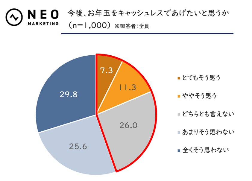 しかし前掲した設問【どのような方法で今年のお年玉をあげたか】で、現状2.1%にとどまっていた「キャッシュレス」でのお年玉ですが、本設問では肯定的な立場(※2)が18.6%存在することに加え、「どちらとも言えない」と中立の立場をとった割合も26.0%と一定数を占めました。