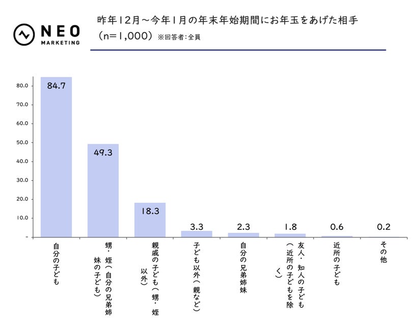 「自分の子ども」へお年玉をあげる割合は84.7%と大多数を占めました。「甥・姪」へは49.3%と約半数を占めたものの、「親戚の子ども」へは18.3%にとどまっています。