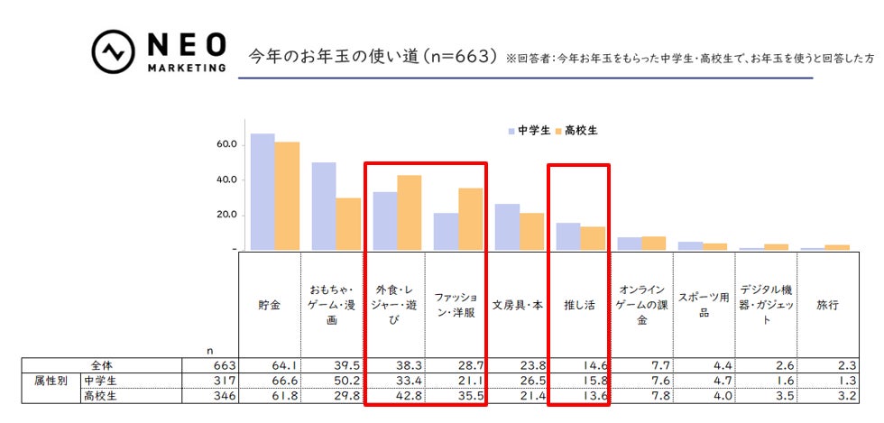 また、昨今は中高生の間でも「推し活」が浸透していますが、お年玉の使い道としては「文房具・本」を下回る約14%にとどまっています。