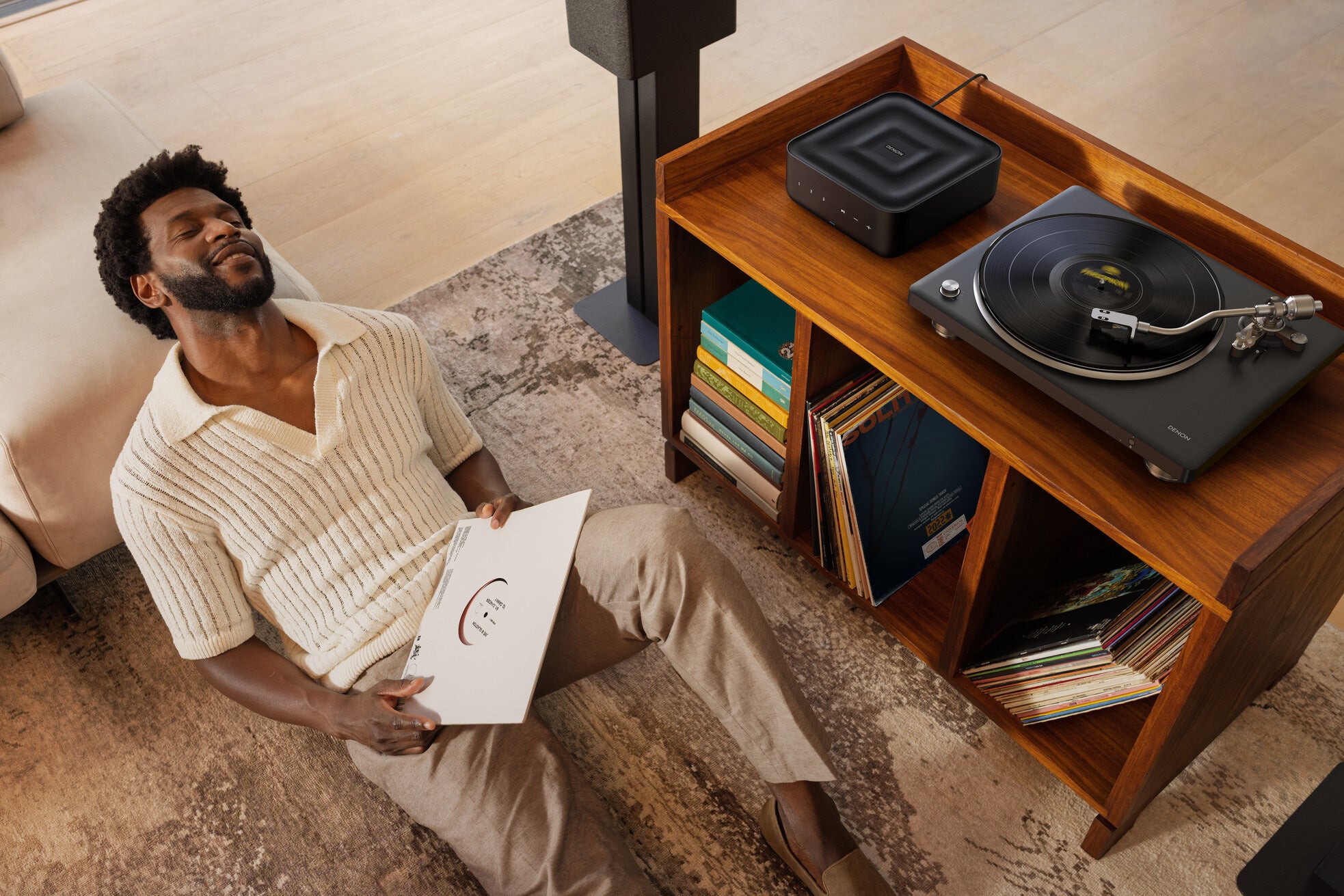 DP-500BTは、デノンの伝統をただ継承するだけの製品ではありません。新たにBluetooth送信機能を搭載することにより、レコードの楽しみ方をさらに発展させるプレーヤーでもあります。単体機やアンプ内蔵のフォノイコライザーに匹敵する高音質を誇る新開発の内蔵フォノイコライザーとaptX Adaptiveなどの高音質なコーデックを組み合わせることで、ワイヤレスでも有線接続に匹敵するクオリティのレコード再生を可能にしました。これによって、レコードプレーヤーと接続するオーディオ機器は、これまでのように並べてレイアウトする必要がなくなります。手元での操作が必要なレコードプレーヤーは近くに置き、コンポやスピーカーは離れた場所に配置することも可能です。もちろんBluetooth対応のイヤフォンやヘッドフォンでレコードを楽しむこともできます。音量調整はDP-500BTのフロント右側のボタンからでも、接続したオーディオ機器からでもできるため、音量調整機能を持たない完全ワイヤレスイヤフォンのような機器でもお使いいただけます。