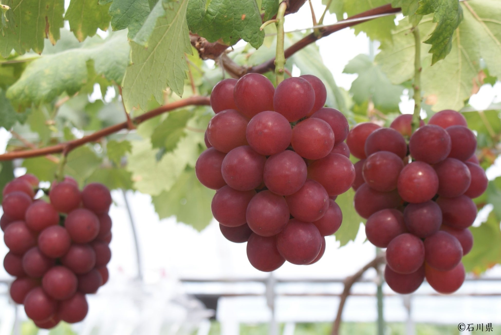 1995年に石川県の農業試験場で生産の取り組みを開始。そこで誕生したのが「ルビーロマン」です。国内でも赤色の大粒品種はとても少ない中、大きさと色鮮やかな赤色をしていることが特長です。酸味が少なく、糖度の高い爽やかな甘みがあり、果汁も豊富で口いっぱいに甘みが広がります。*(石川県より資料・情報提供)