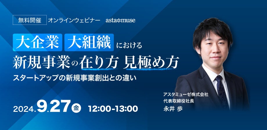 アスタミューゼ株式会社(本社:東京都千代田区、代表取締役社長 永井歩)は、2024年9月27日(金)12:00-13:00に、経営企画・事業戦略担当者、新規事業担当者向けの無料ウェビナー「大企業・大組織における新規事業の在り方・見極め ~スタートアップの新規事業創出との違い~ 」開催します。