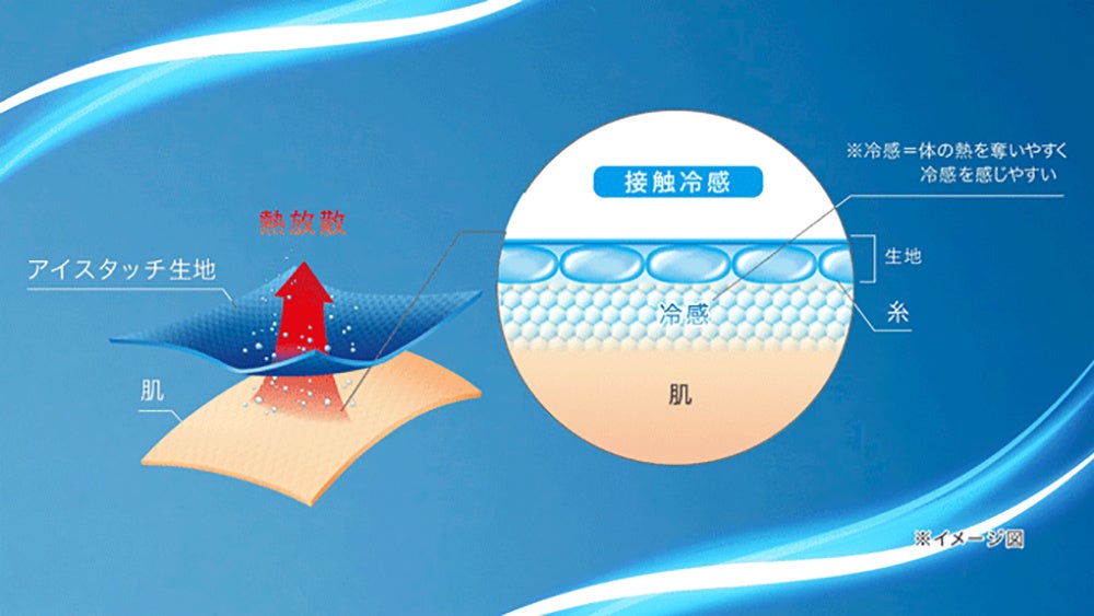 熱伝導率の高い特殊な糸を用いることで体の熱を奪いやすく、これにより高い冷感性と速乾性を実現。熱伝導率とは、熱の伝わりやすさのことで、接触冷感素材は熱伝導率が高い繊維を使用することで触れた時の涼しさや冷たさが感じられます。
