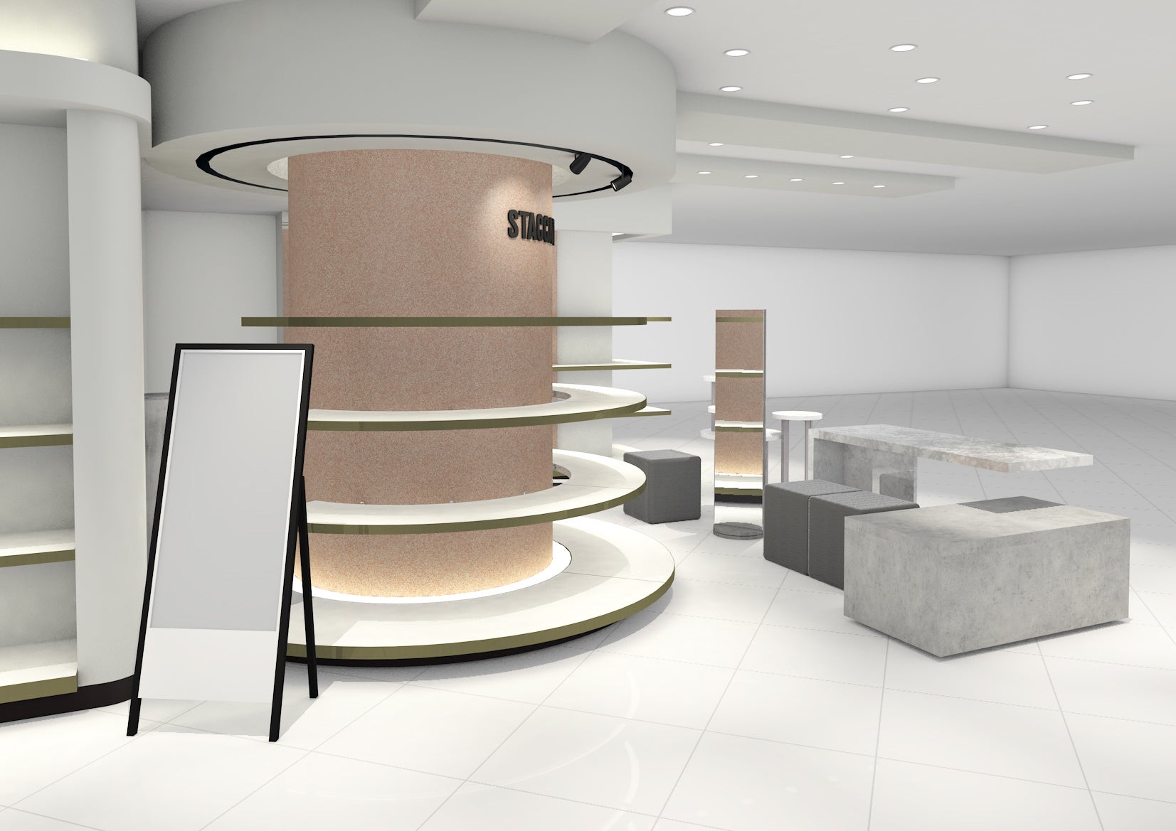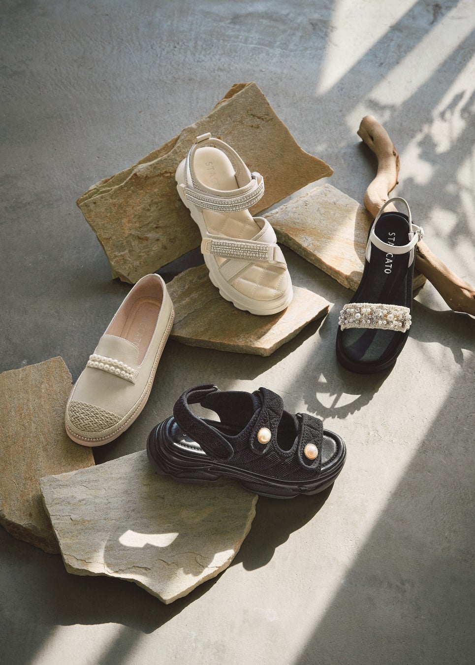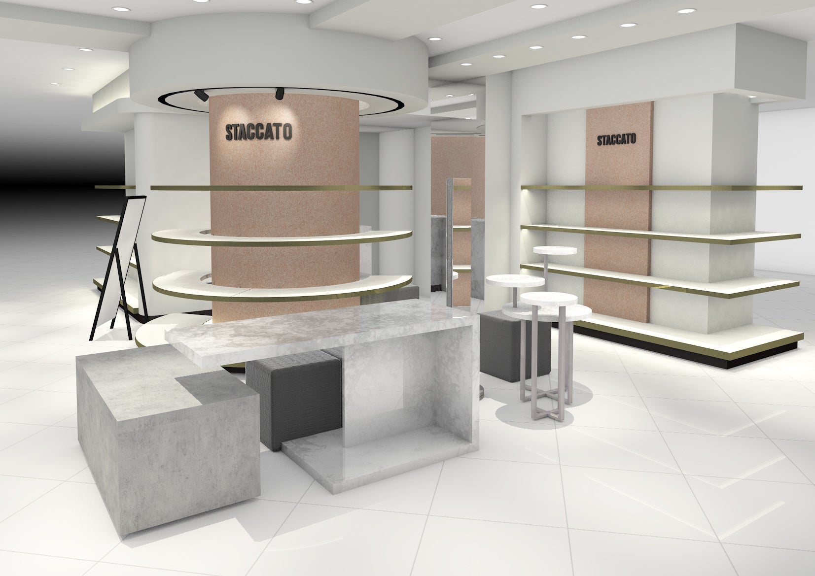 Hong Kong発のグローバルシューズブランド「STACCATO(スタッカート)」新しいエッセンスを取り入れた内装は、モノトーンを基調にベースを大理石調のモダンなカラーリングにしコントラストを意識したオリジナルティ溢れる世界観に。
