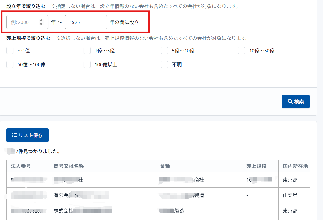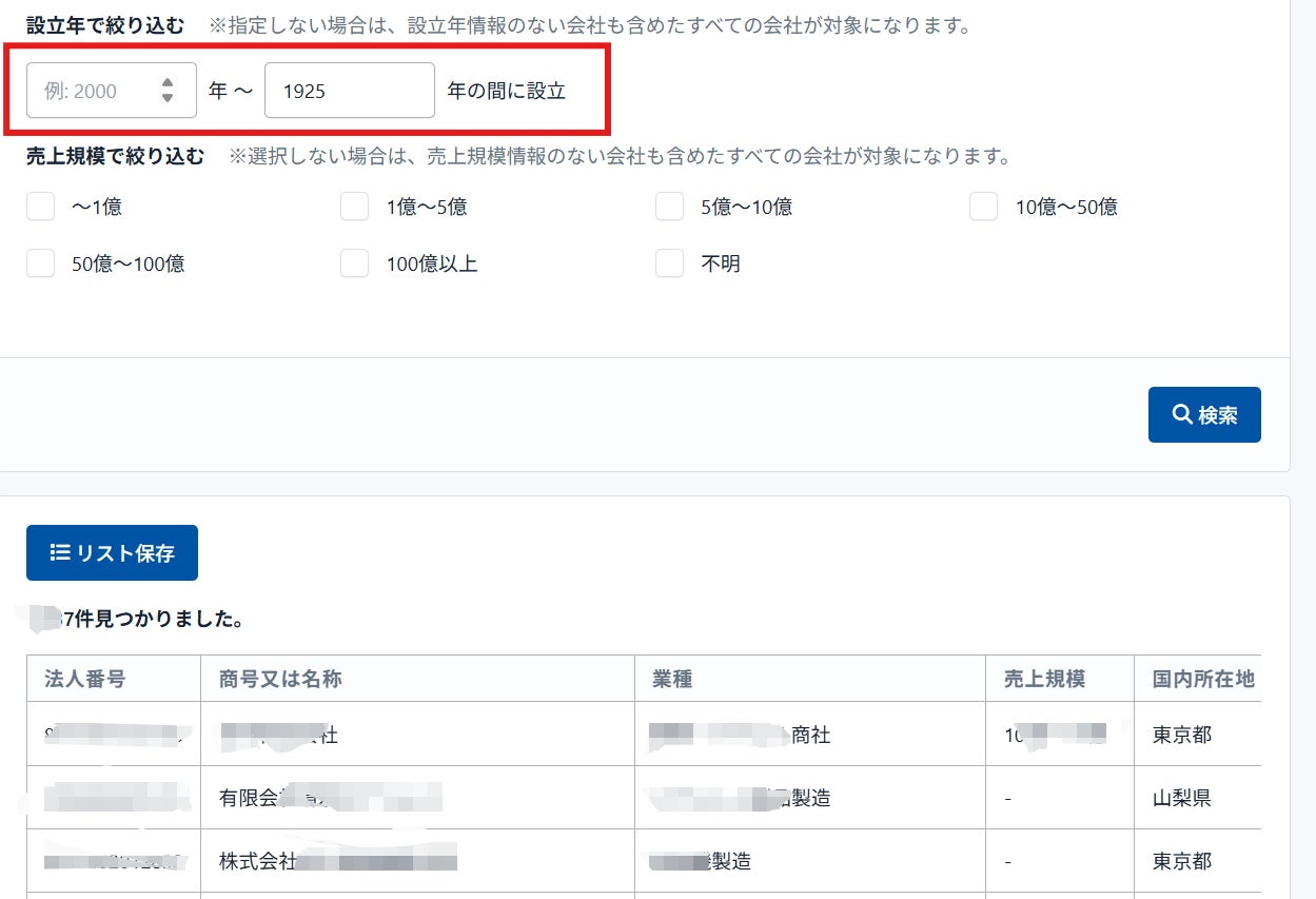 これまでの「業種」「都道府県」「売上規模」「社名」による絞り込みに加え、「設立年」による