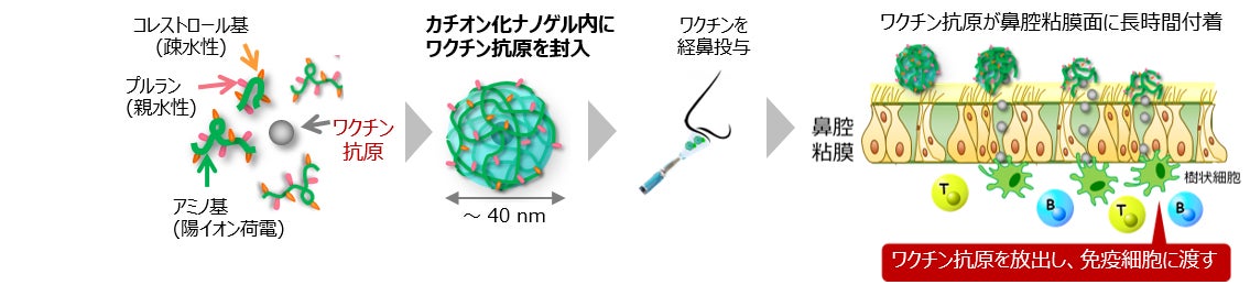 こうした課題の克服のため、本研究では、「カチオン化ナノゲル」内に封入したワクチン抗原を鼻から投与して粘膜面に届ける「噴霧型経鼻ワクチン」の開発を目指します。