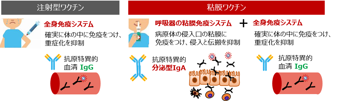 そこで本研究では、粘膜に防御免疫を効果的に誘導できる粘膜ワクチンの研究開発に取り組み、注射型ワクチンが有する「発症や重症化を防ぐ効果」に加え、新たに「病原体の侵入そのものを防ぐ効果」も有するワクチンの開発を目指します。