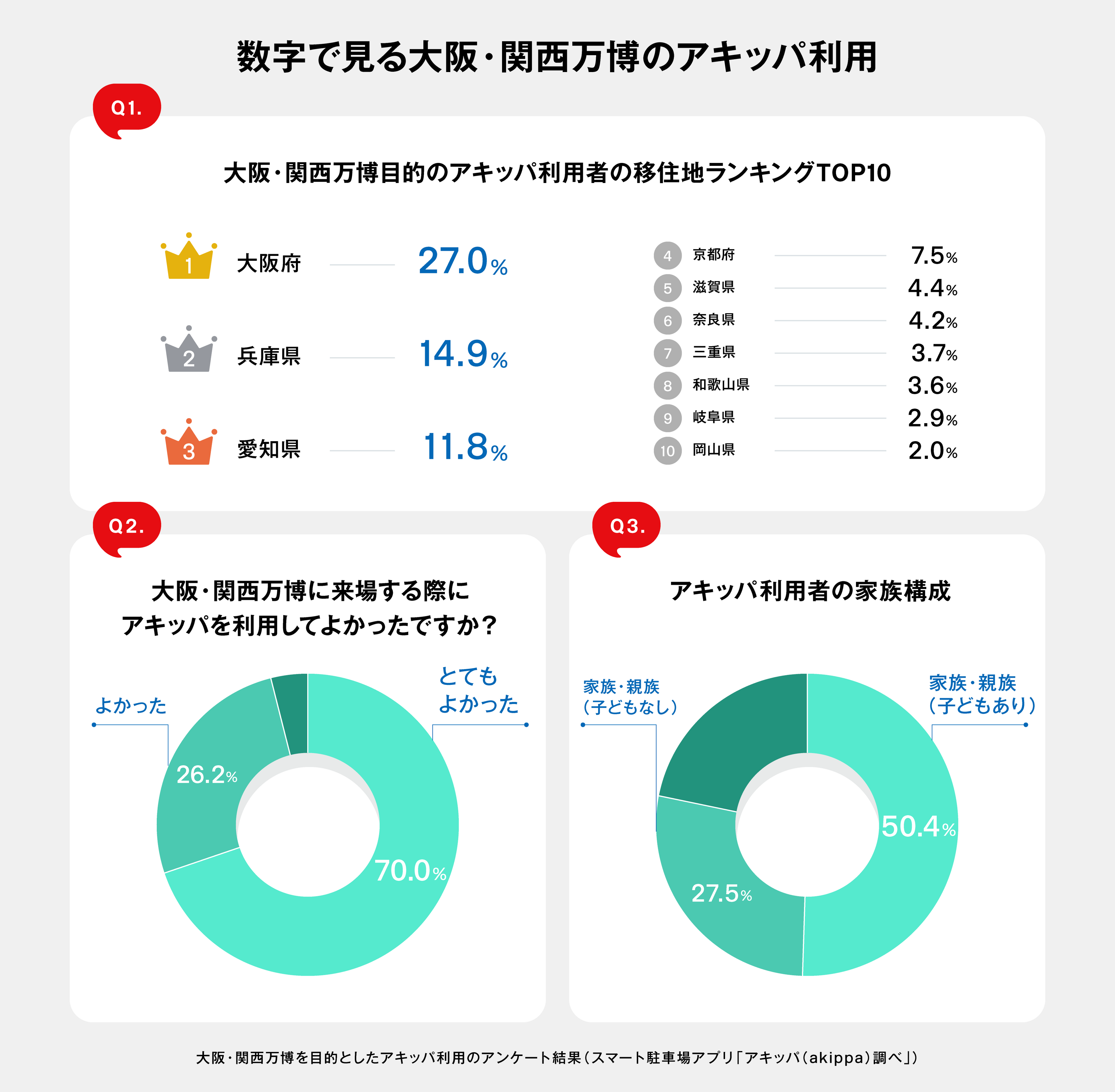 スマート駐車場アプリ「アキッパ(akippa)」を運営するakippa株式会社(代表取締役社長 CEO:金谷元気)は、大阪・関西万博開催期間のアキッパ利用実績およびアンケート結果をまとめました。