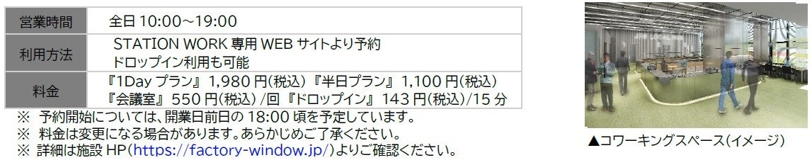 さまざまなつながりを生み出す場としてコワーキングスペースを提供します。誰でも好きな時間に利用でき、STATION WORK専用WEBサイトからの予約利用も可能になります。