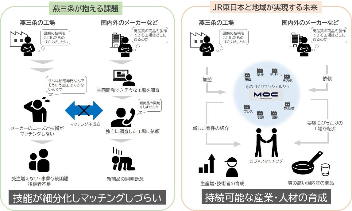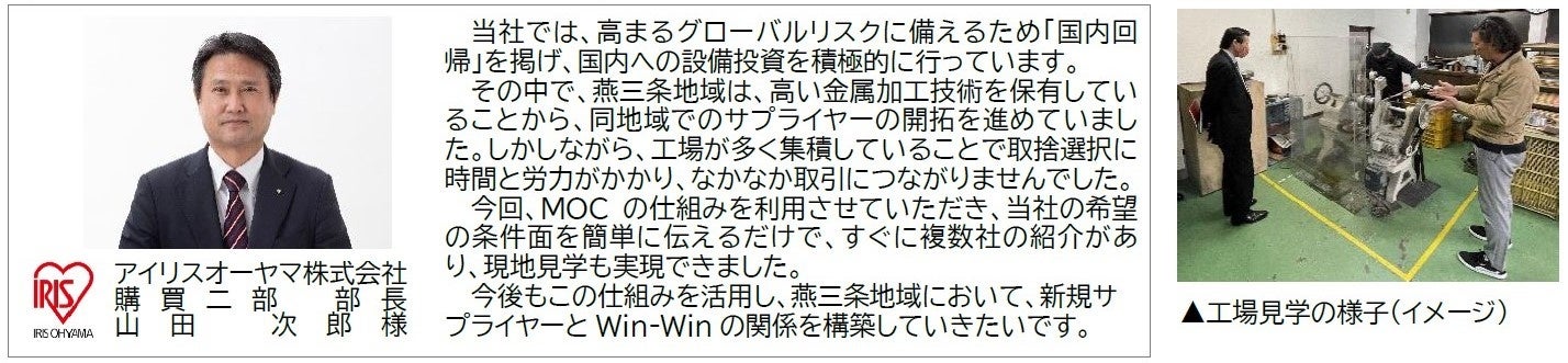※ 「MOC」は、株式会社ドッツアンドラインズが運営する、ものづくりコンシェルジュです。国内外のメーカーから受けるものづくりの依頼に対し、燕三条の協力企業から最適な組み合わせを提案するビジネスマッチング機能を有します。