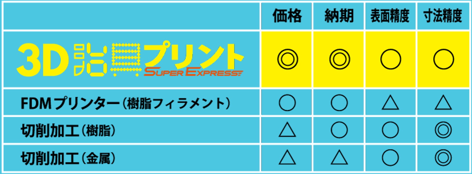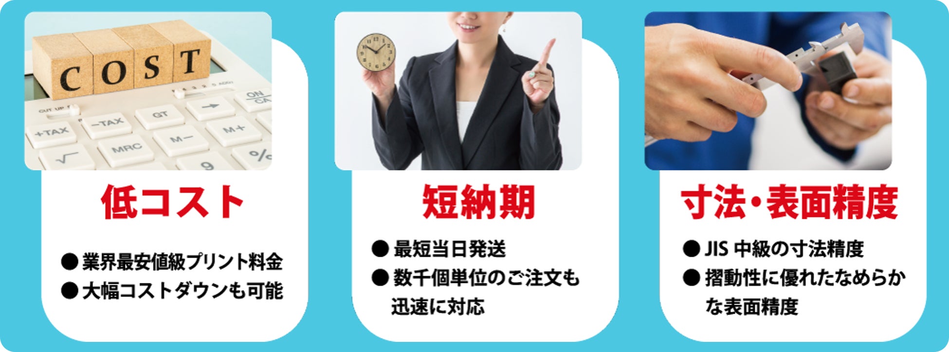 「3D治具プリント」は、表面精度や寸法精度に優れた光造形方式の3Dプリンターを用い、治具として求められる品質を担保しつつ、低価格と短納期を実現する画期的なサービスです。金属ほどの強度が不要で、FDMプリンター以上の精度が必要な治具を「早く」「安く」欲しい技術者の方に最適です。