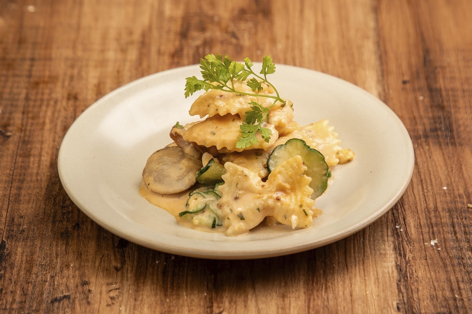 「ファルファッレ」というリボン型のショートパスタを使用しており、ひだの部分にソースがよく絡むのが特徴です。サワークリームを加えることでさっぱりとした味わいに仕上げました。見た目も可愛いらしく、お酒のおつまみにもぴったりな一品です。