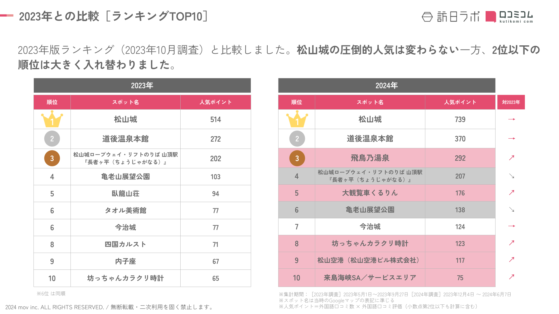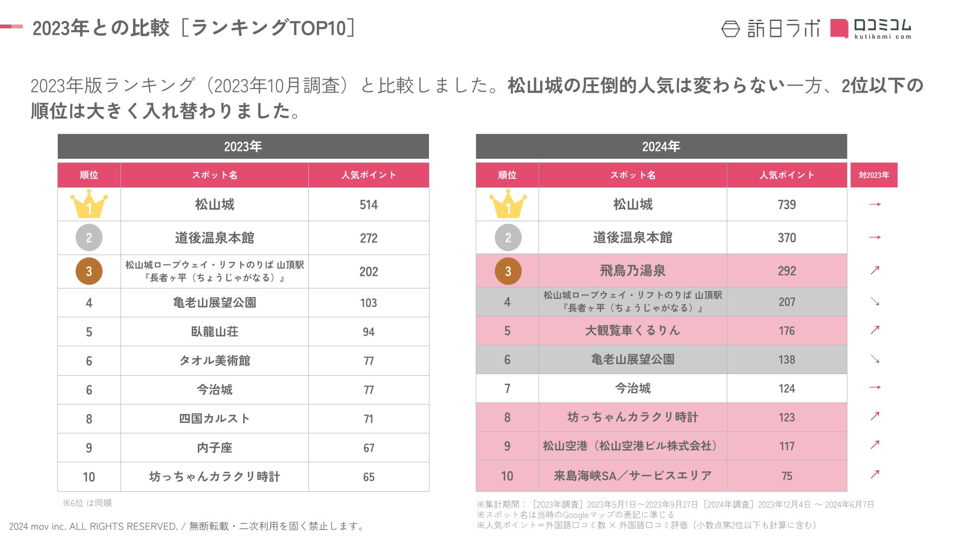 松山城の圧倒的人気は変わらない一方、2位以下の順位は大きく入れ替わりました。また、人気スポットは松山・今治市に集中しました。
