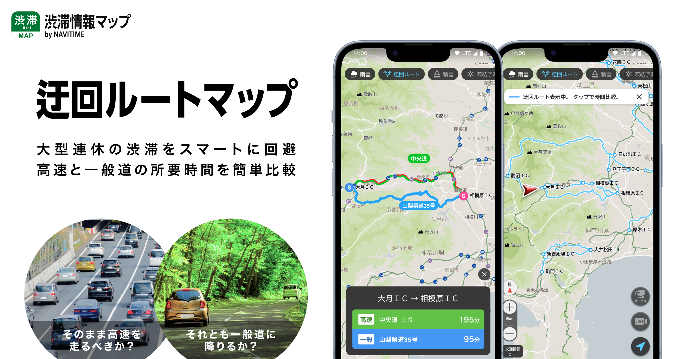 株式会社ナビタイムジャパン(代表取締役社長:大西 啓介、本社:東京都港区)は、リアルタイムの道路交通情報に特化したアプリ『渋滞情報マップ by NAVITIME』にて、2026年4月23日(木)より、渋滞多発区間で高速経由と一般道経由の所要時間とルートを比較できる「迂回ルートマップ」機能を提供開始いたします。