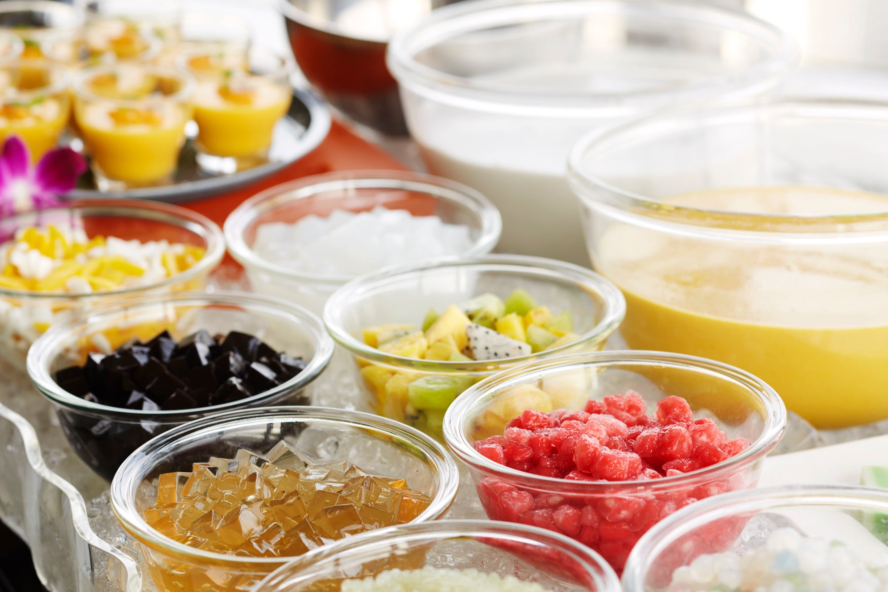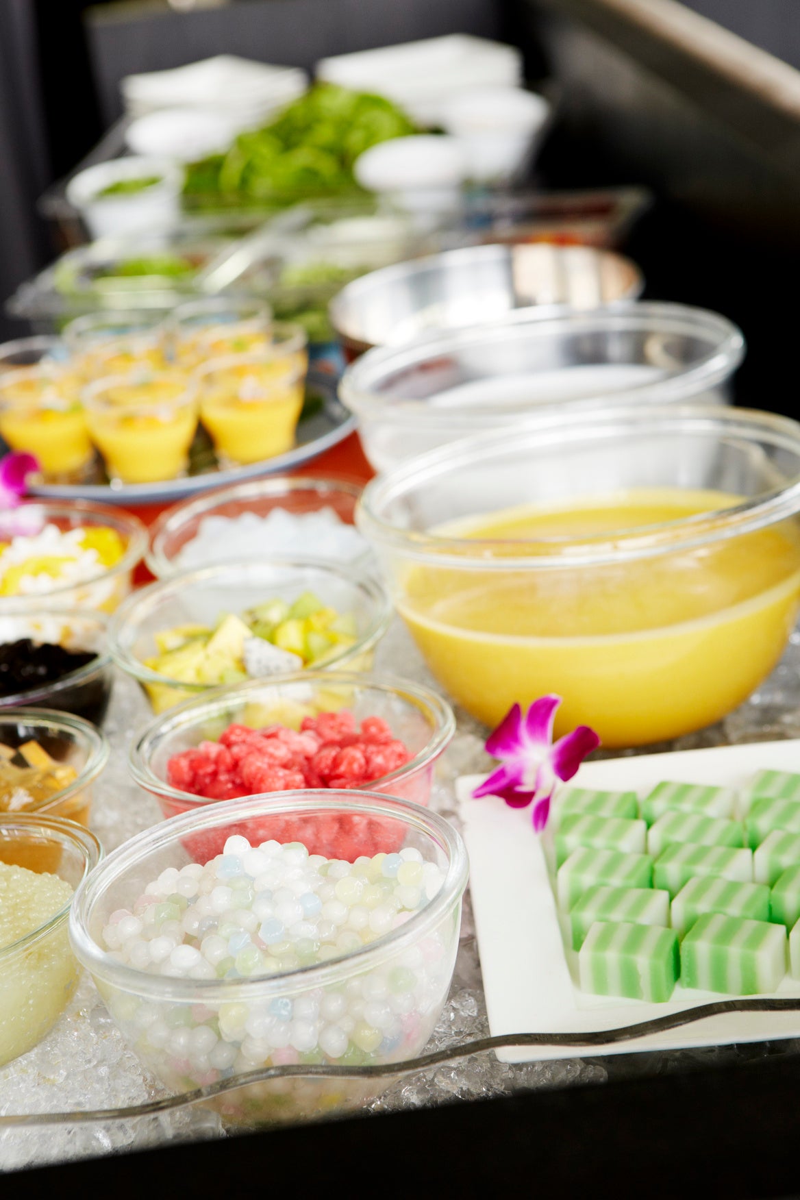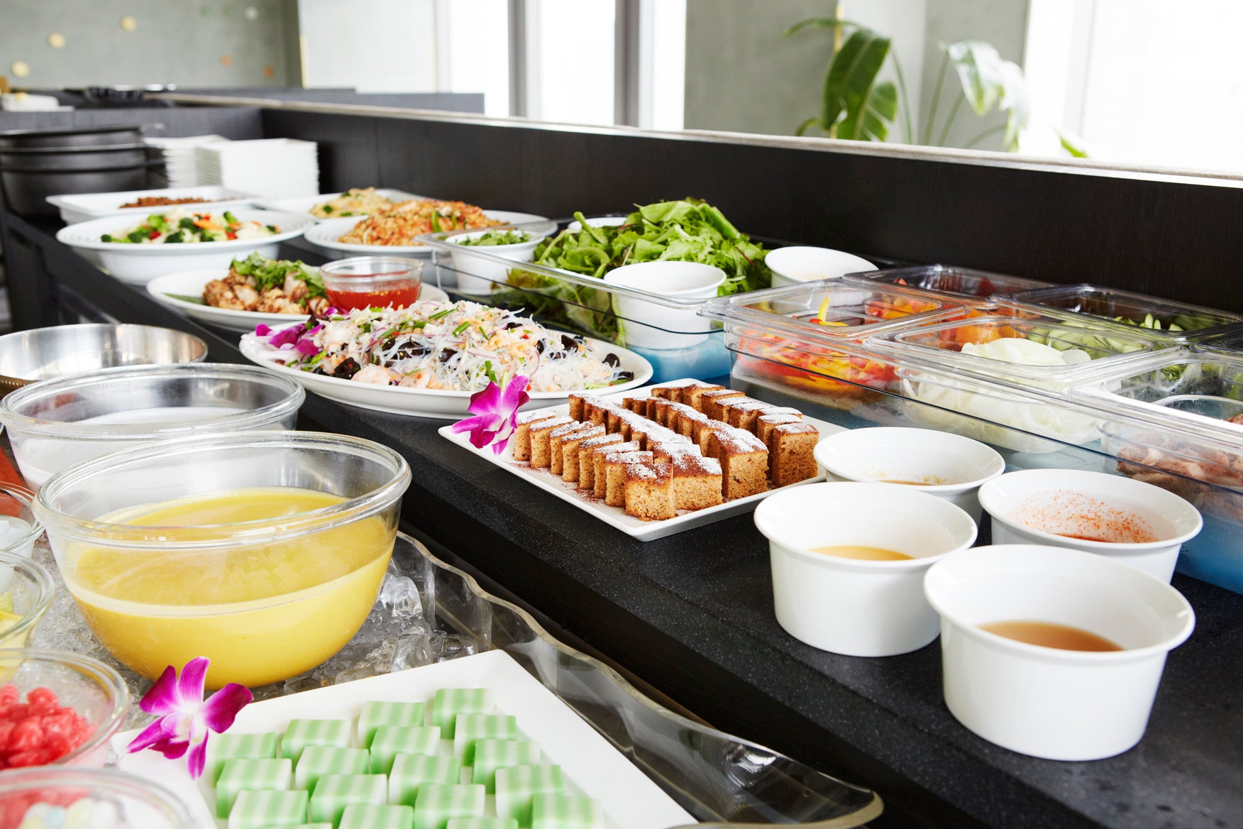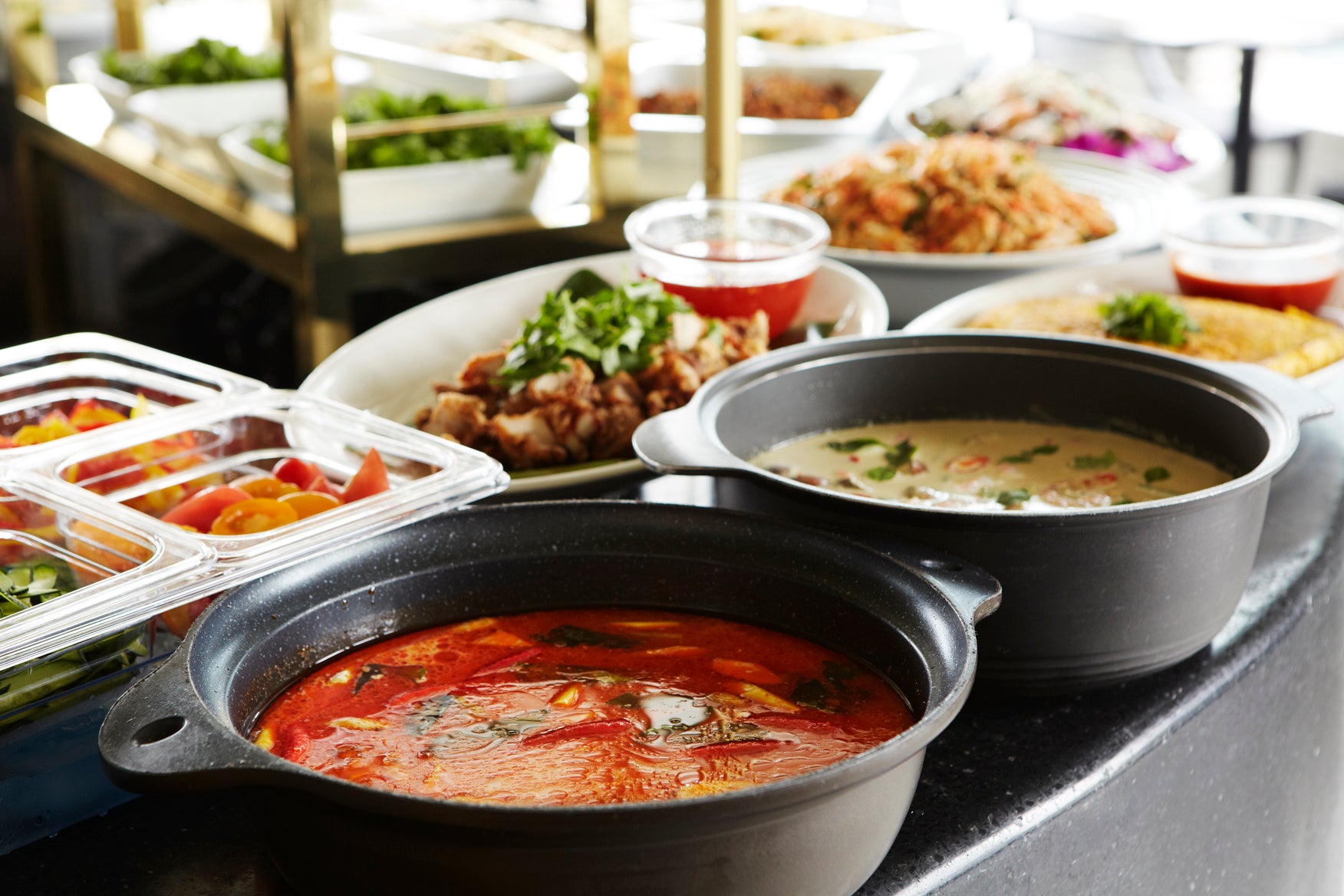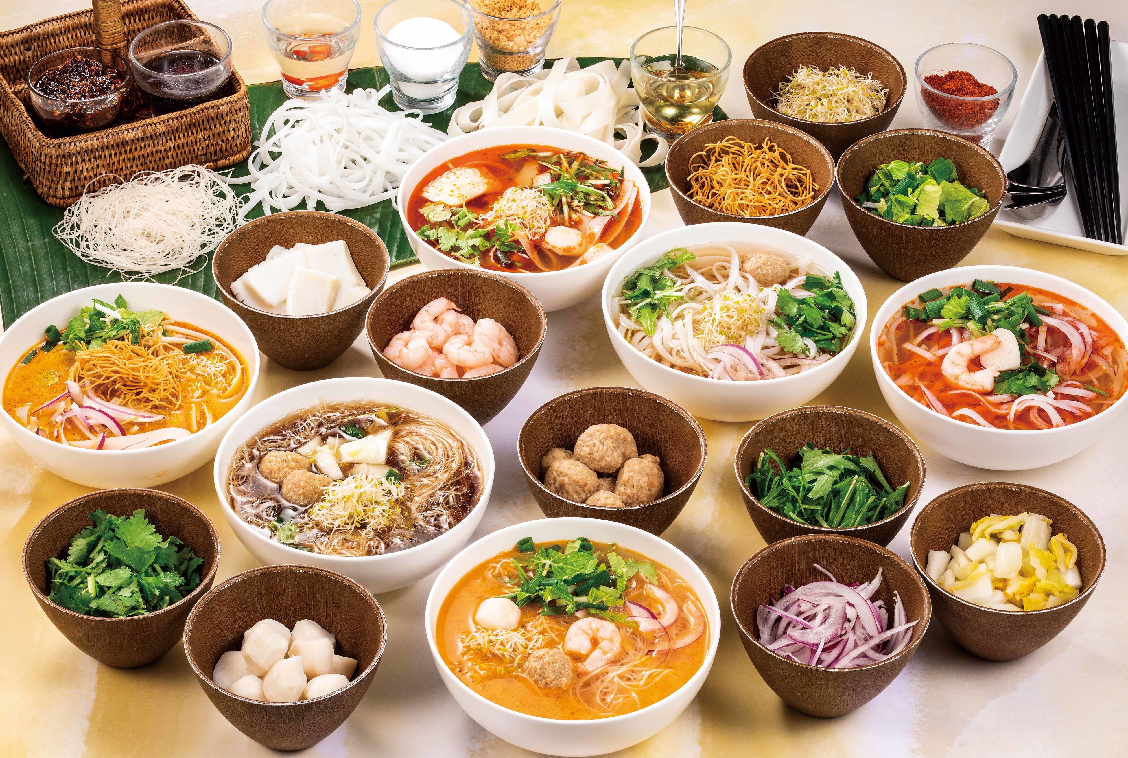 さっぱり・スパイシー・濃厚などスープ5種、“センミー”(細麺)・“センレック”(平麺)・“センヤイ”(幅広麺)のライスヌードル3種、海老や魚のすり身、パクチーや紫玉ねぎ、水菜など10種以上のトッピングをお好きな組み合わせでお好きなだけお召し上がりいただけるヌードルブッフェ。