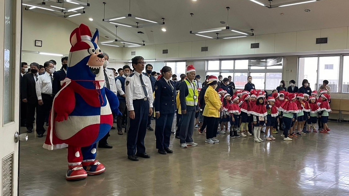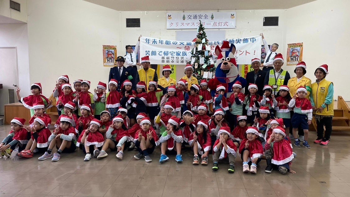 12月21日(木)に行われた那覇警察署の「交通安全クリスマスツリー点灯式」にゴーディーが参加いたしました。当日は那覇警察署署長や「与儀こども園」の子どもたちが書いたクリスマスカードで装飾されたクリスマスツリーが飾られており、年末年始の交通事故防止及び飲酒運転撲滅、交通安全を祈願し、クリスマスツリーの点灯式が行われました。