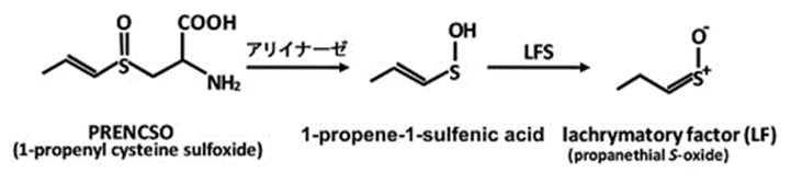 催涙成分を作り出す新規酵素(LFS)を発⾒し、催涙成分の⽣成が下図のようにアリイナーゼと LFS が順番に働くことで進むことを明らかにし、学術雑誌「Nature」に発表。 催涙成分が⽣成される仕組みが解明できたことで、この仕組みがない新品種のタマネギが作れれば「涙のでないタマネギ」が開発可能と考える。研究は次のステップとなる重イオンビームを⽤いた突然変異育種による品種作出をスタート。 |