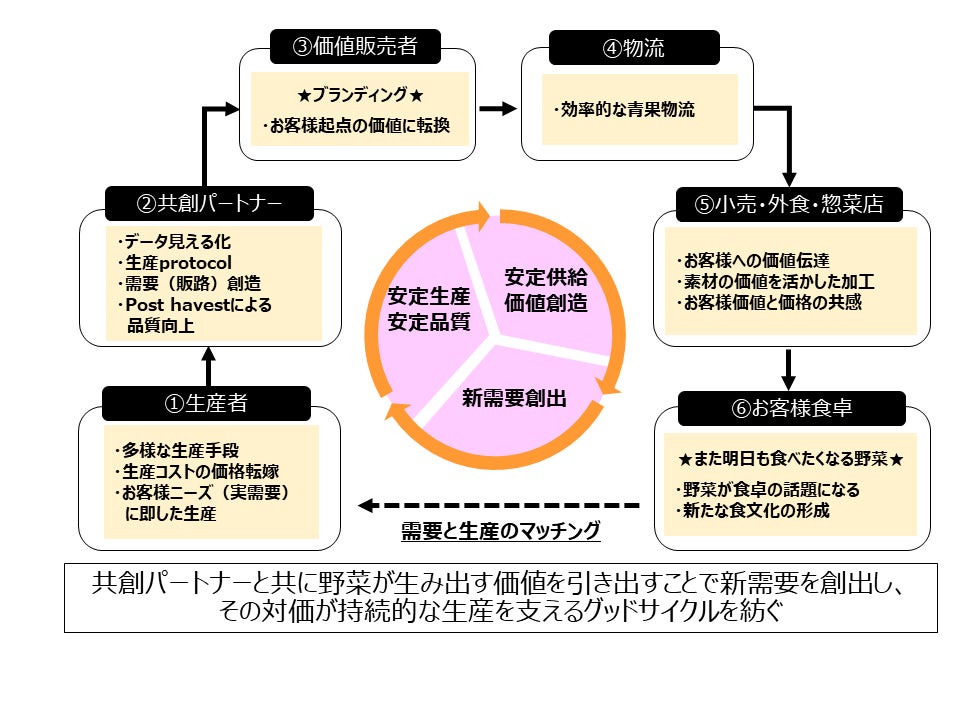 今後は、データ駆動型でサステナブルな農業⽣産、⻑期の品質保持を実現する⼯程管理、野菜の価値を需要に変えるブランディングを実践する共創プラットフォームを構築し、「また明⽇も⾷べたくなる野菜」を⾷卓へ継続的にお届けするコンセプトの実現をめざしていきます。