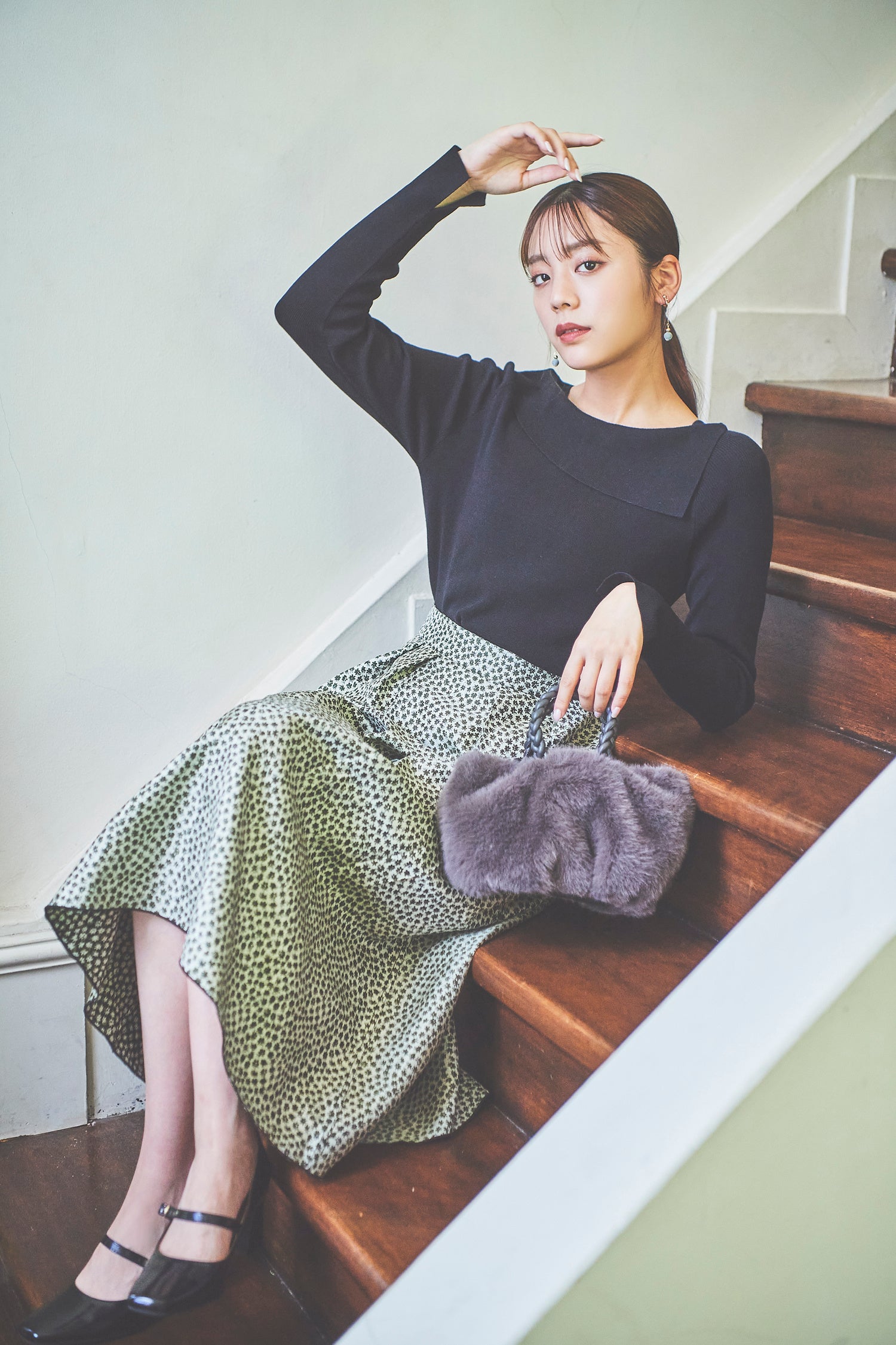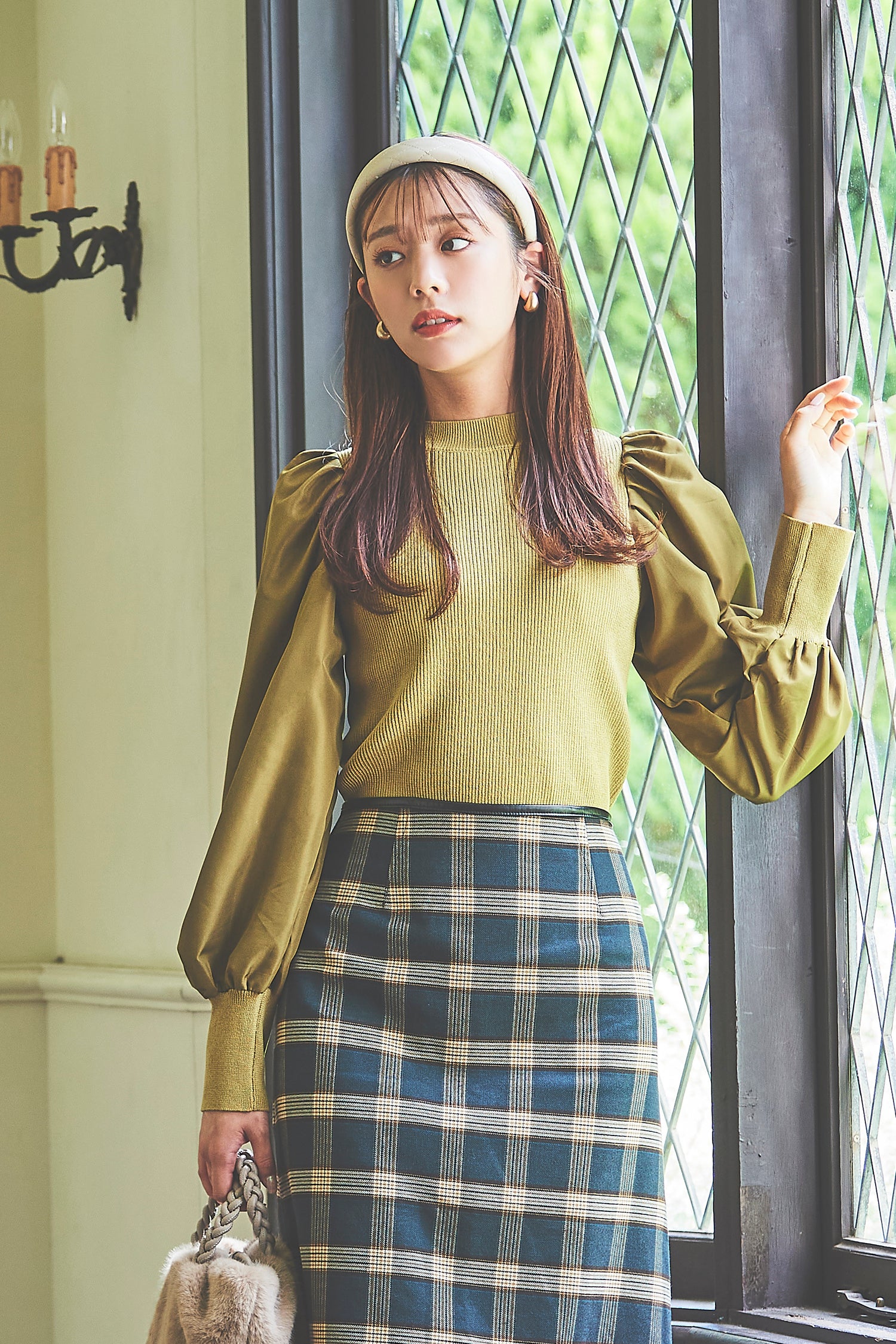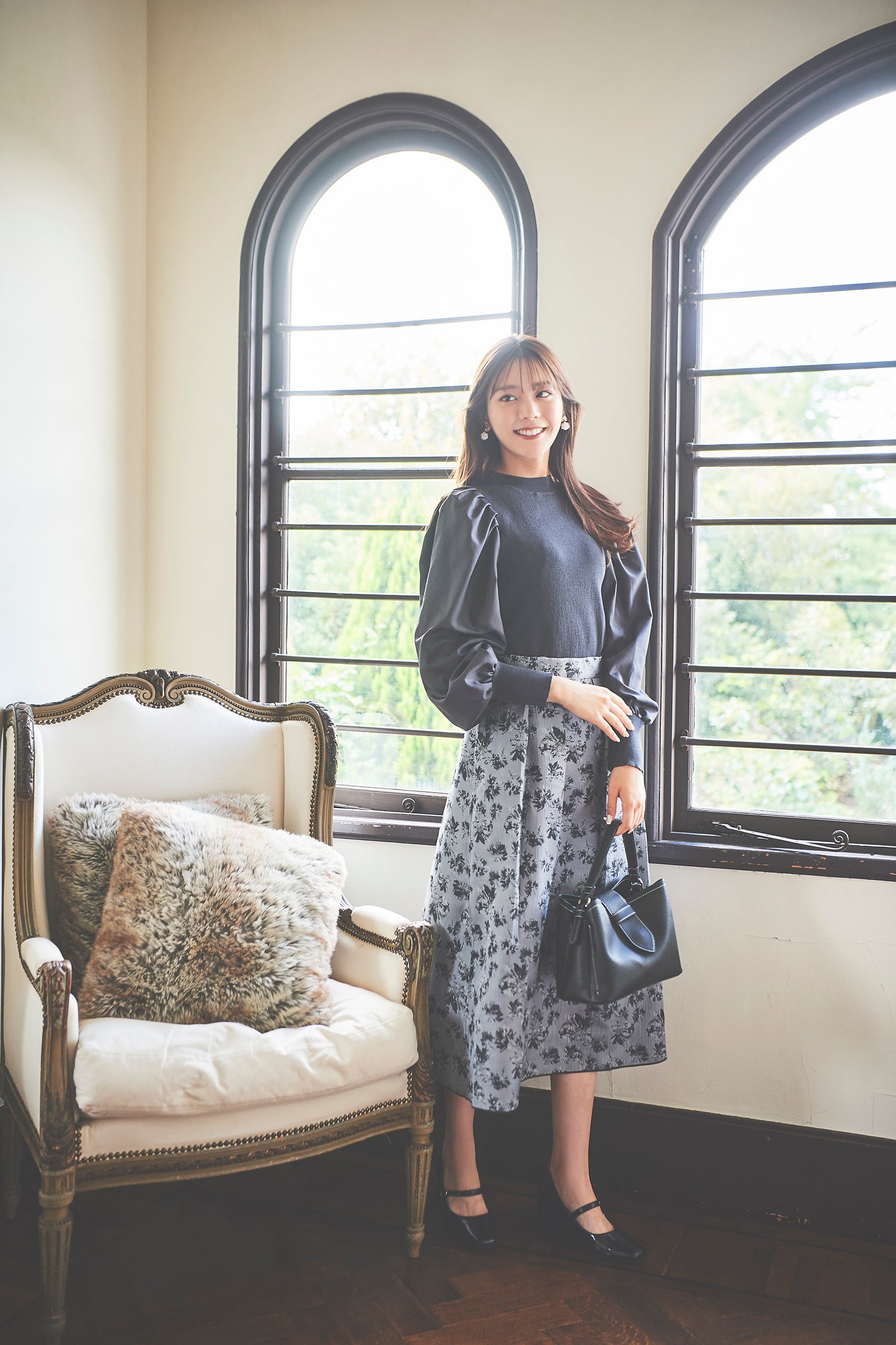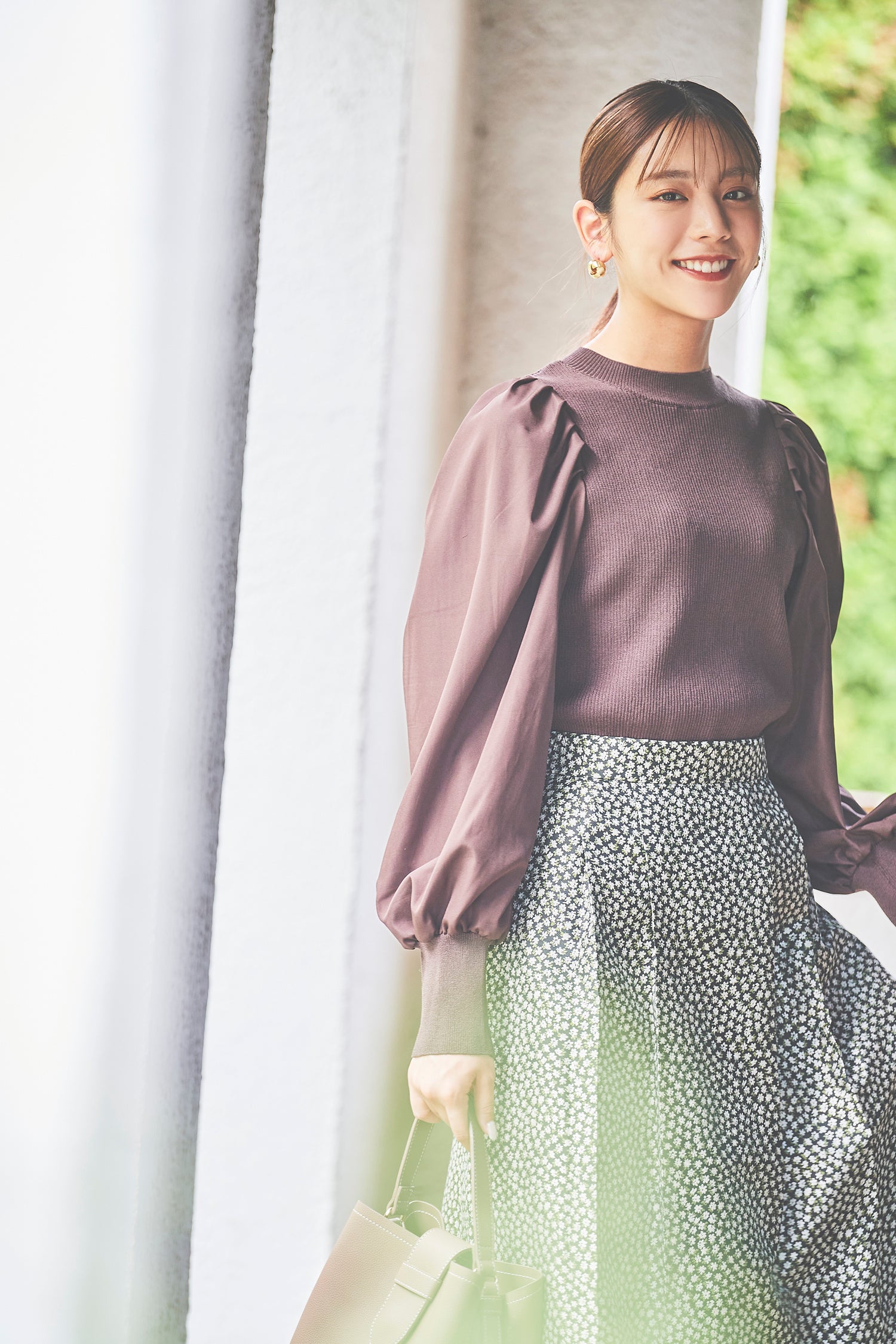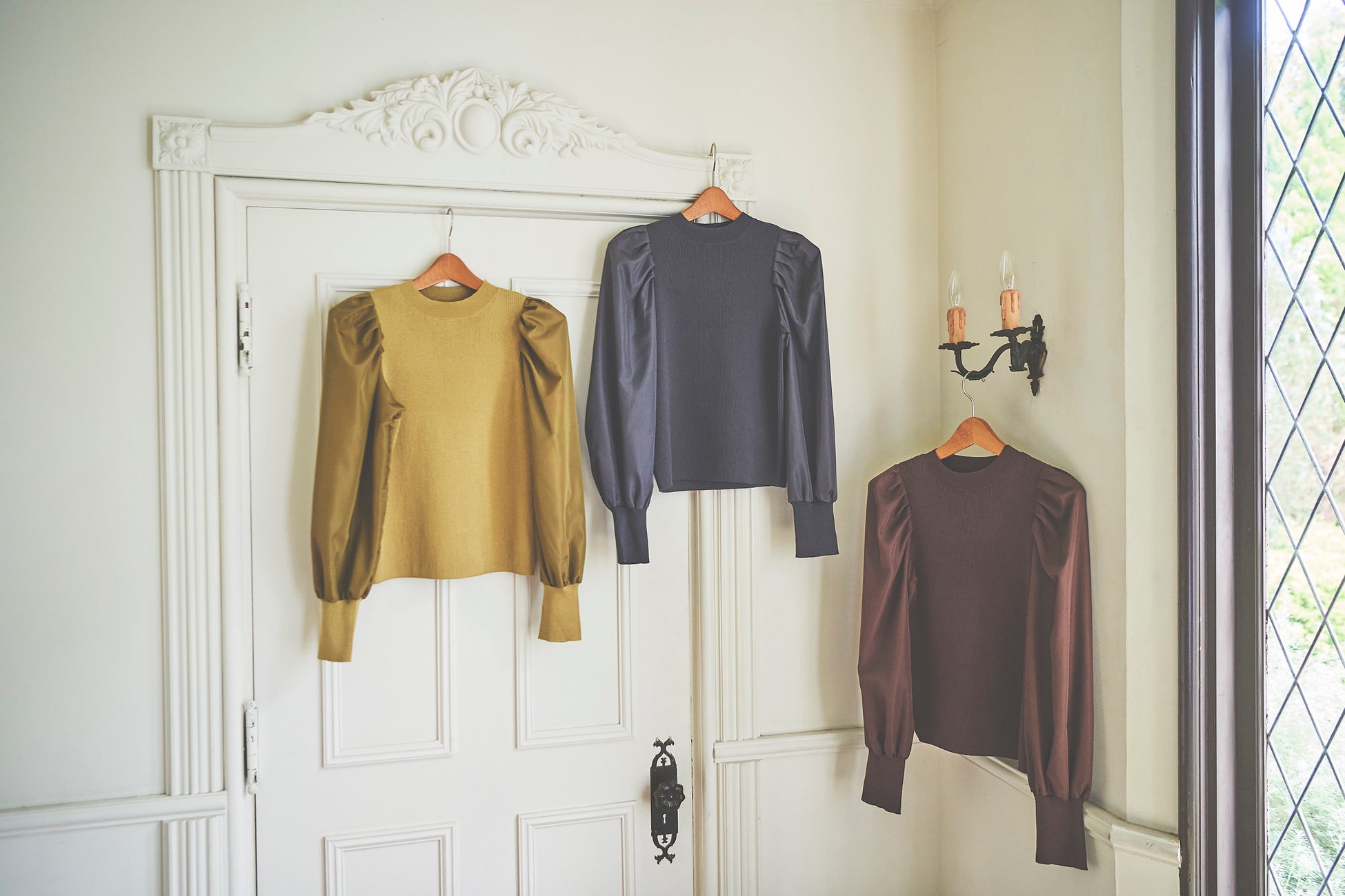 品のある細めのリブニットは、スリーブ部分をブラウス生地に切り替えた1枚で着映えするデザイン。貴島さんの大好きなボリュームスリーブでフェミニンな印象に仕上げました。もう1種類は、ベーシックでありながらも、デコルテをきれいに魅せるアシンメトリーな襟ぐりニットをご用意いたしました。