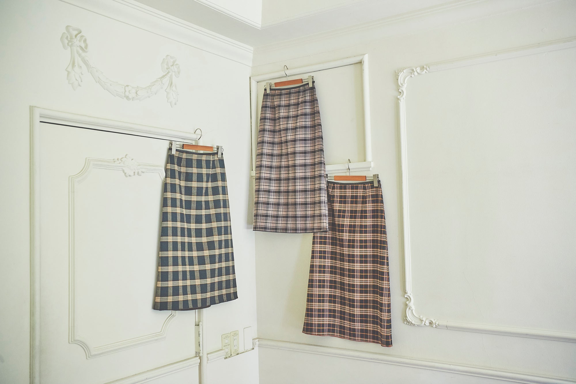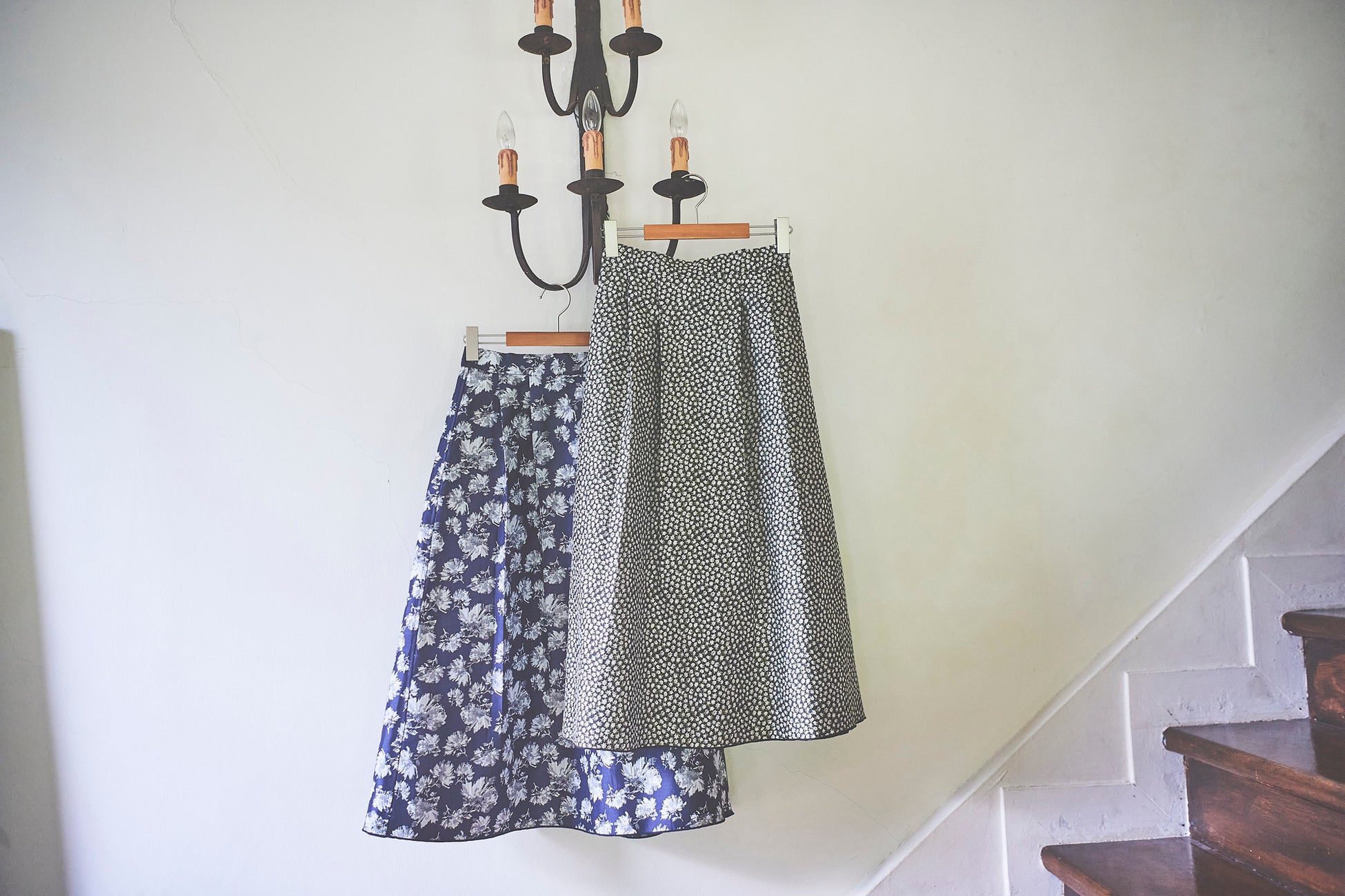 また、1着で2通りの使い方が出来るリバーシブルスカートも2種類のデザインが登場。ハリのある上品なジャカード素材でクラシカルな雰囲気を楽しめるスカートは、華やかな中花柄と可愛らしい小花柄に。もう一方のスカートは、秋らしいカラーのチェック柄と無地をセレクトし、印象ががらりと変わる1着。タイト過ぎない台形シルエットで履き心地の良さも魅力です。