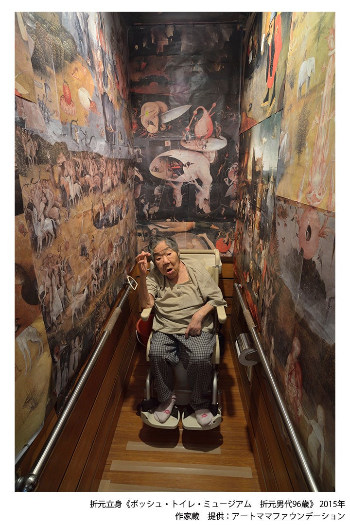 《ボッシュ・トイレ・ミュージアム》は、折元立身の自宅トイレ内に設置されたインスタレーション作品です。トイレ室内には、ヒエロニムス・ボッシュ(ボス)の有名な三連祭壇画《快楽の園》が拡大コピーされてコラージュされています。生活空間に芸術作品が介入する様子は、生活と芸術の境界を揺るがし続ける折元の制作態度を端的にあらわしているともいえるでしょう。今回は、自宅トイレ室内の再現を行い、合わせて鑑賞者が中に入ってポートレート写真を撮り、その写真を壁面に貼りつけていくことで展示が展開していきます。