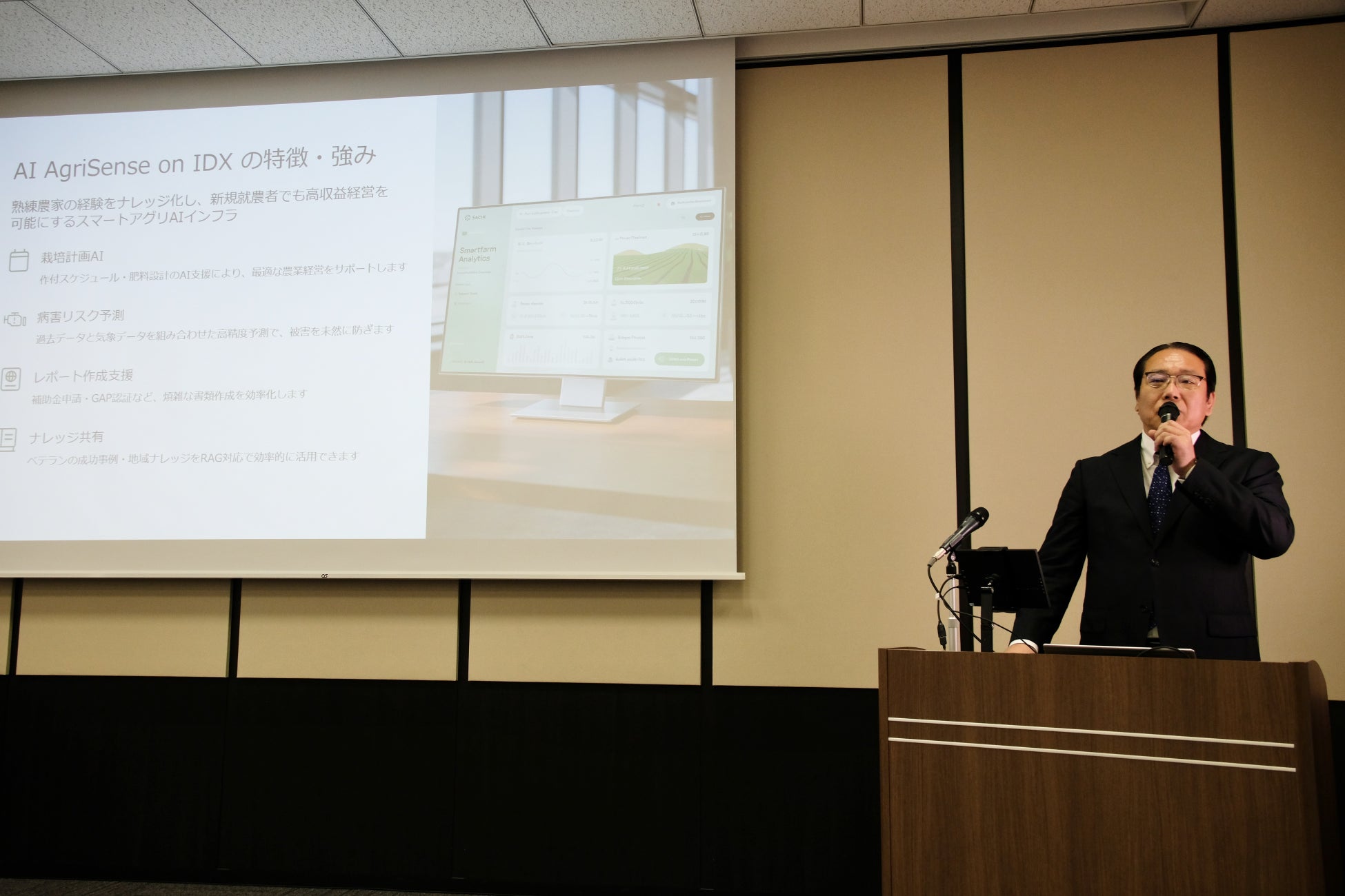 弊社志田より、新規就農者や中小農家でもAIを活用して高収益化を実現できるようなプラットフォーム「AI AgriSense on IDX」を紹介しました。このシステムは、農業に関わる各種データ(気象・土壌・作業記録・作付データなど)をIDX基盤に集約し、生成AIで可視化・判断支援を行う仕組みです。熟練農家の勘や経験もノウハウ化してAIに取り込むことで、属人的な判断を標準化。テンプレートやプロンプト支援など業界向けモジュールを備え、初めて農業に携わる方でも直感的に活用できる環境を整えています。事例を交えて、AIによる施肥・病害予測・収量分析などの活用例が紹介され、「農業DXへの橋渡し」としての役割を強調しました。