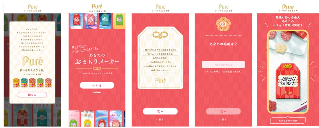 「ピュレグミが、あなたのおまもりになって、桜咲く輝かしい春を迎えるための力になりますように。」との想いを込めて、あなただけの応援メッセージがデザインされた”おまもり”を生成できるコンテンツ「あなたのおまもりメーカー」が登場。いくつかの簡単な質問に答えるだけで、あなたの性格や、今の気持ちにあった応援メッセージ付きのおまもり画像を生成することができます。