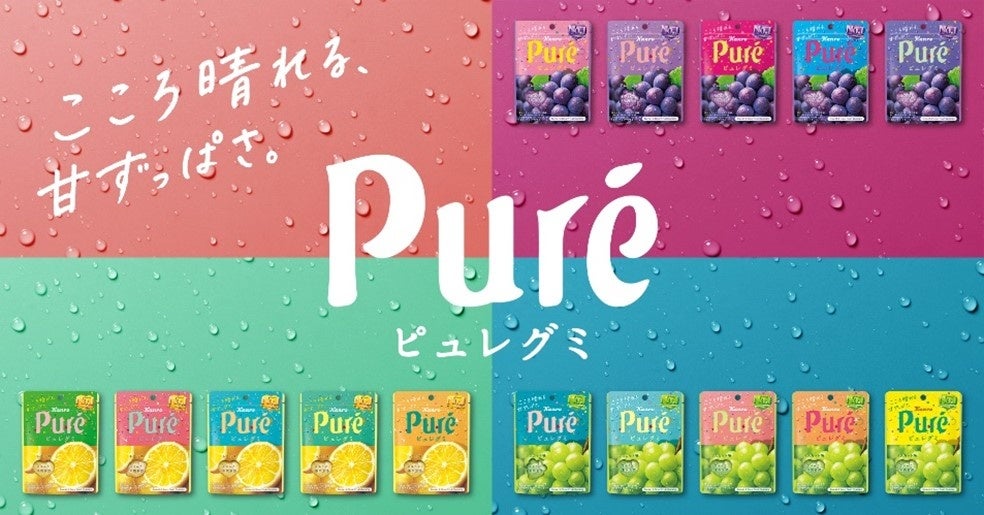 『ピュレグミ』は、2002年の発売以来、幅広い世代の方からご支持いただいているカンロの人気商品です。フルーツのおいしさを引き出す“すっぱいパウダー”と独自の“果肉食感”により、噛むほどにフルーティーな甘ずっぱいおいしさが広がり、食べた瞬間こころが晴れるように、ちょっとハート(気持ち)があがるハート型のグミです。