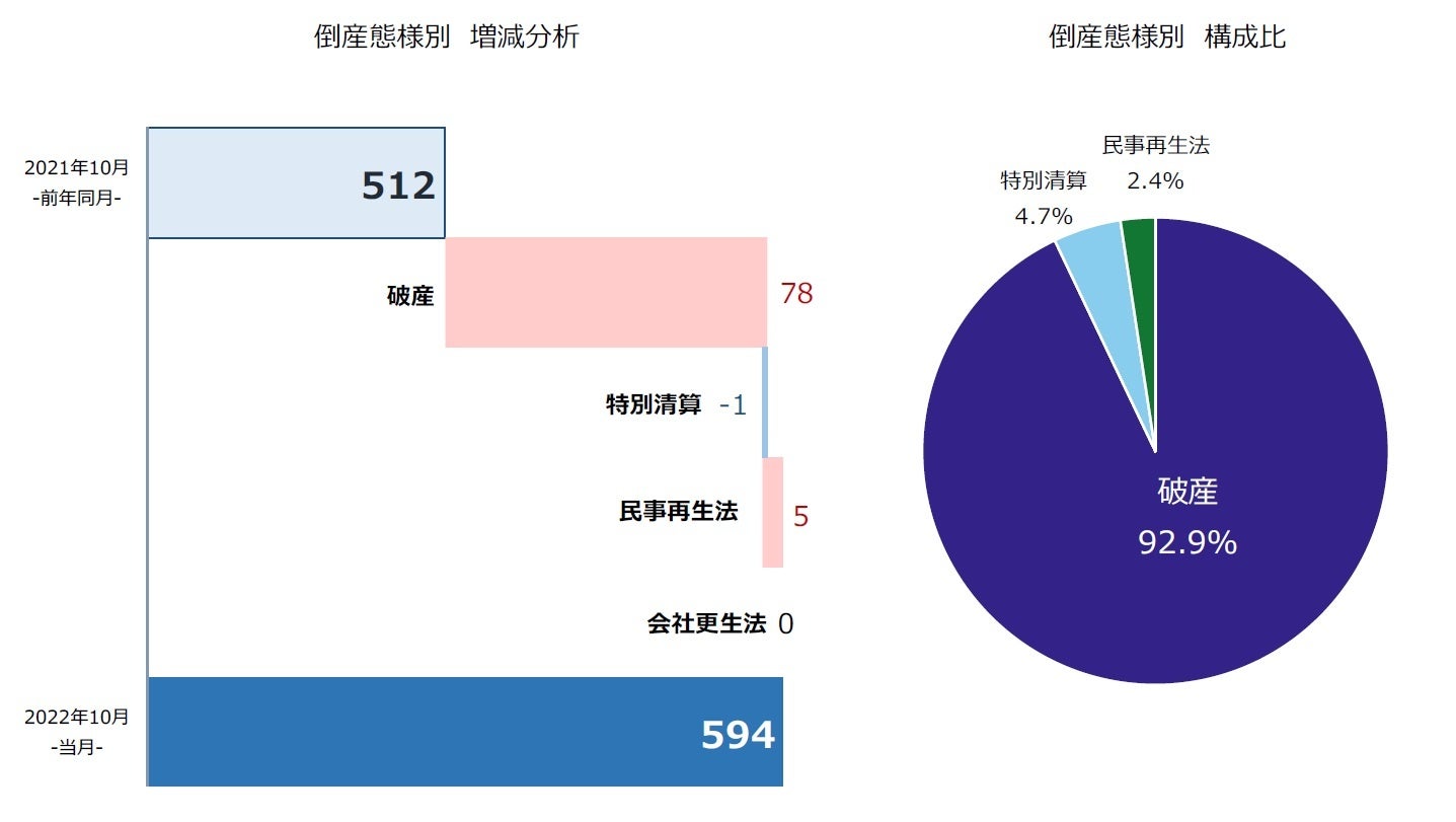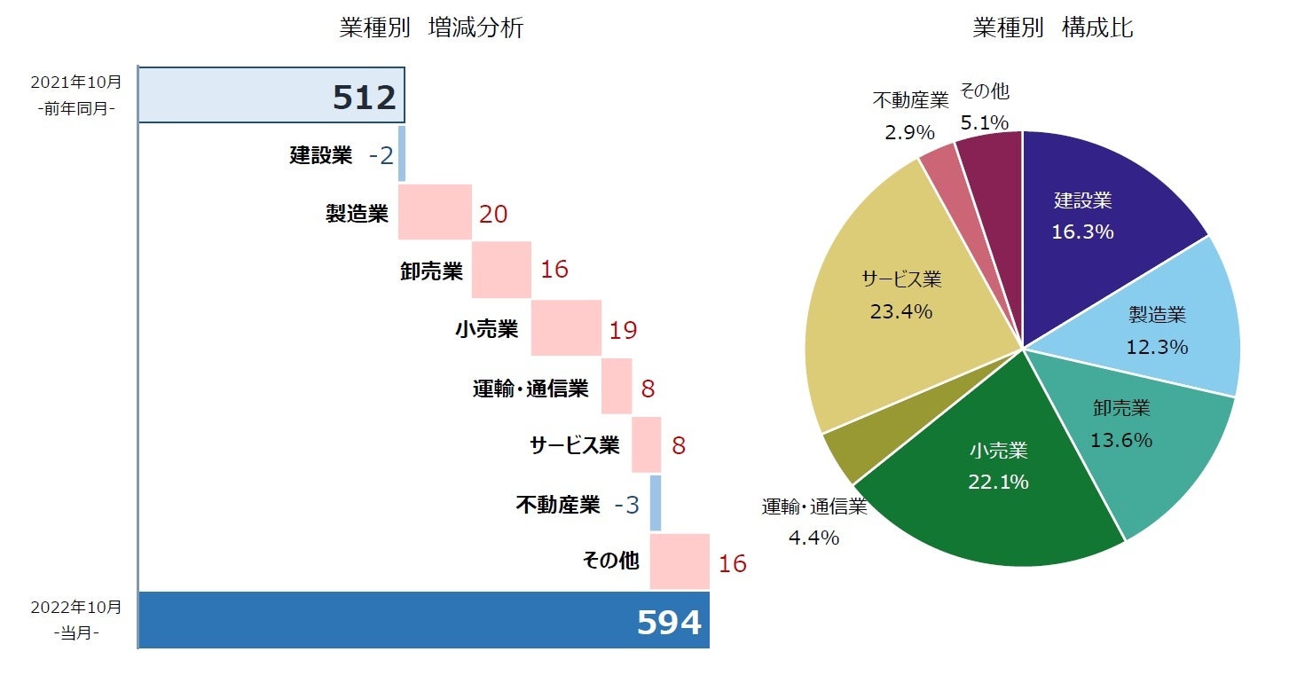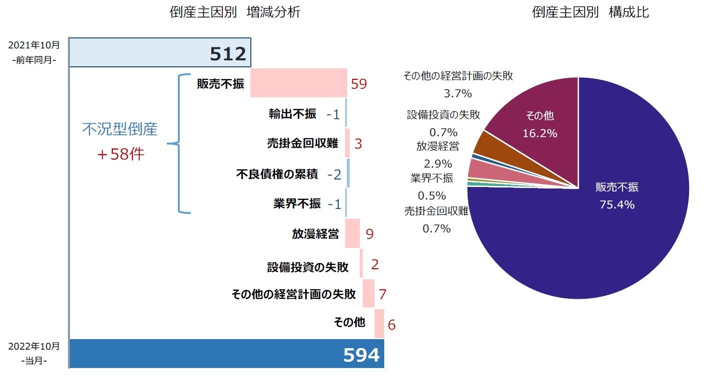 2022年10月の企業倒産は594件発生し、前年同月(512件)を大幅に上回ったほか、3月の587件を上回って今年最多を更新した。また、今年5月以降6カ月連続での増加となるなど倒産増加トレンドが強まるほか、7カ月ぶりに全都道府県で倒産が発生するなど、倒産増の動きは都市部から地方へと伝播しつつある。