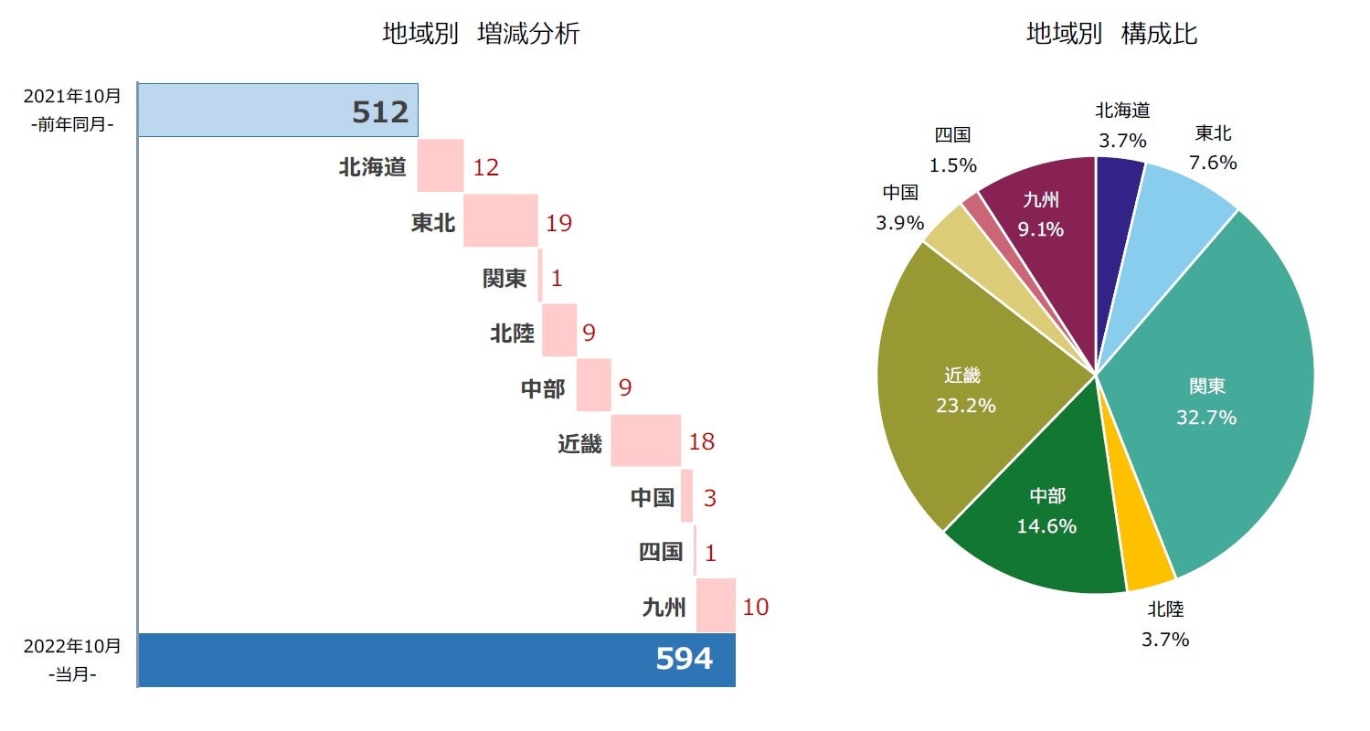 - 地域別にみると、全地域で前年同月比増加。東北(前年同月26件→45件、73.1%増)は過去20年で最長の10カ月連続増加