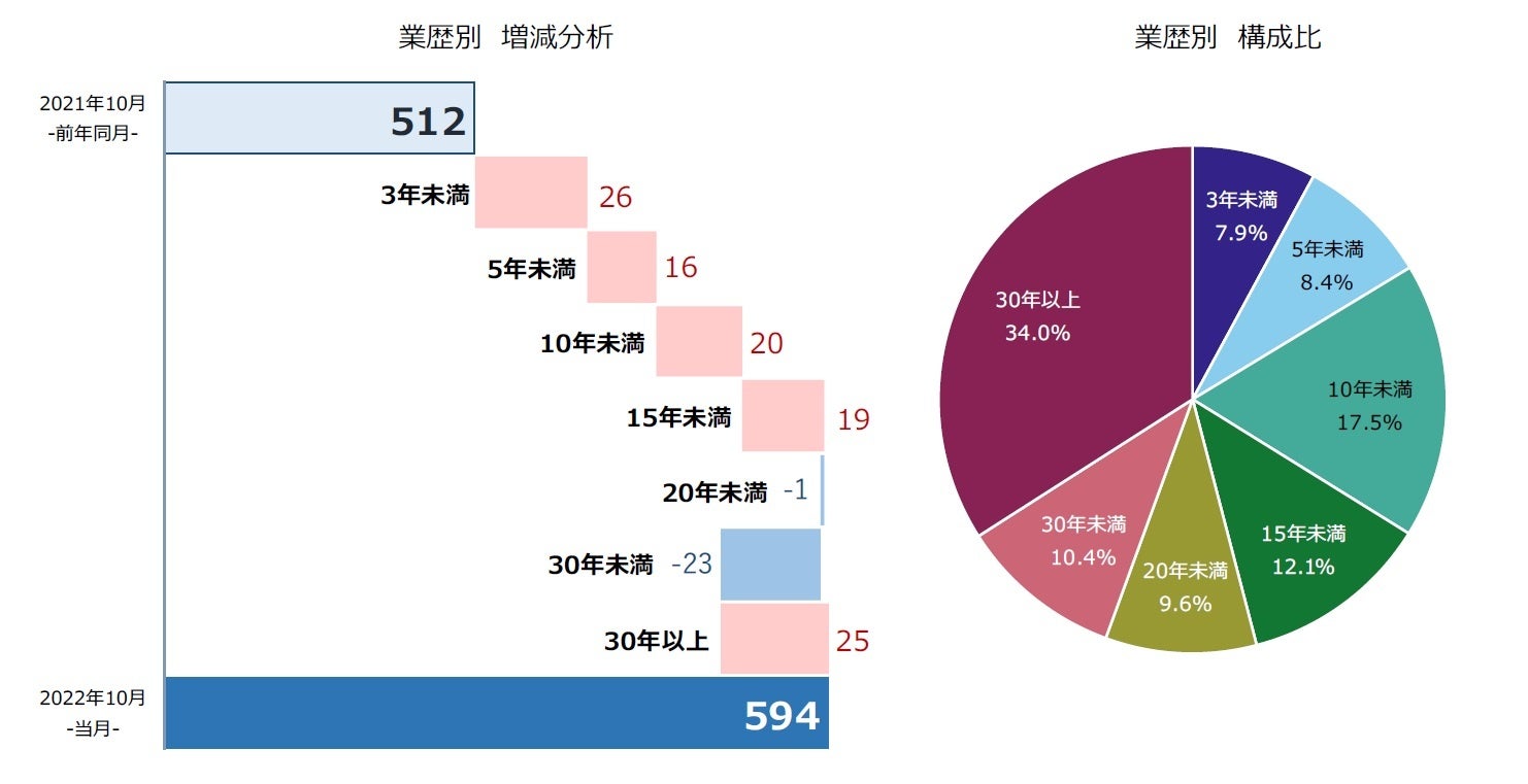 また、「30年以上」が202件(前年同月177件、14.1%増)で、業歴別で最多。このうち、老舗企業(業歴100年以上)の倒産は7件発生した。
