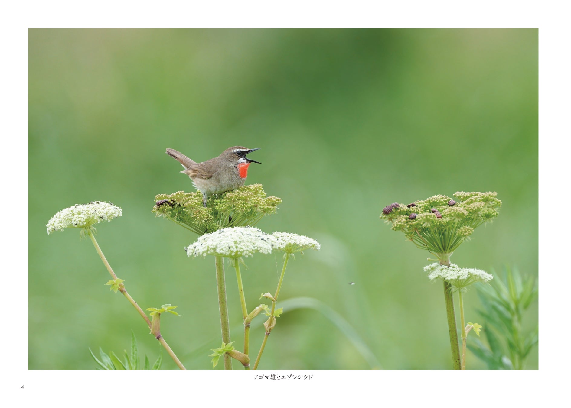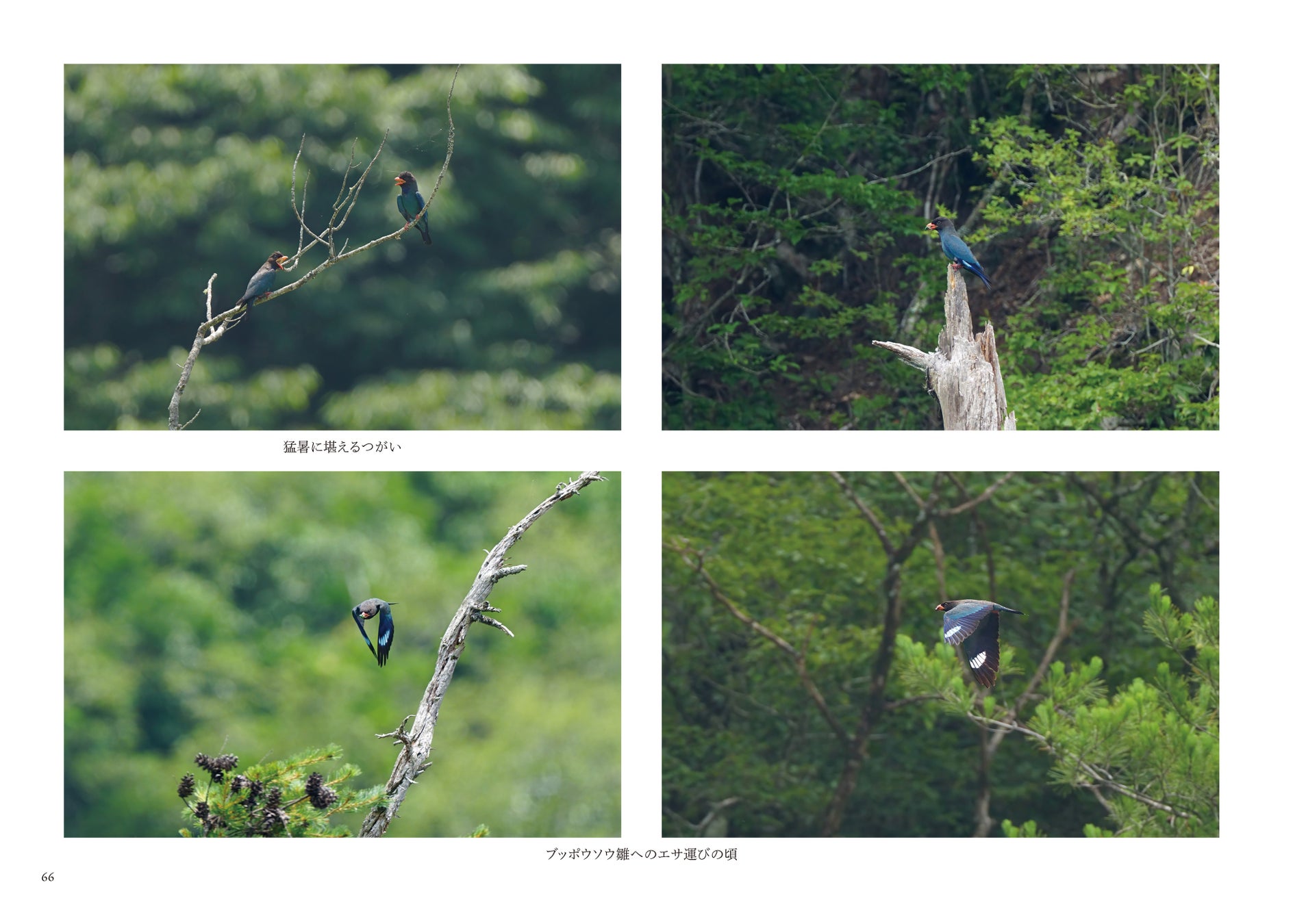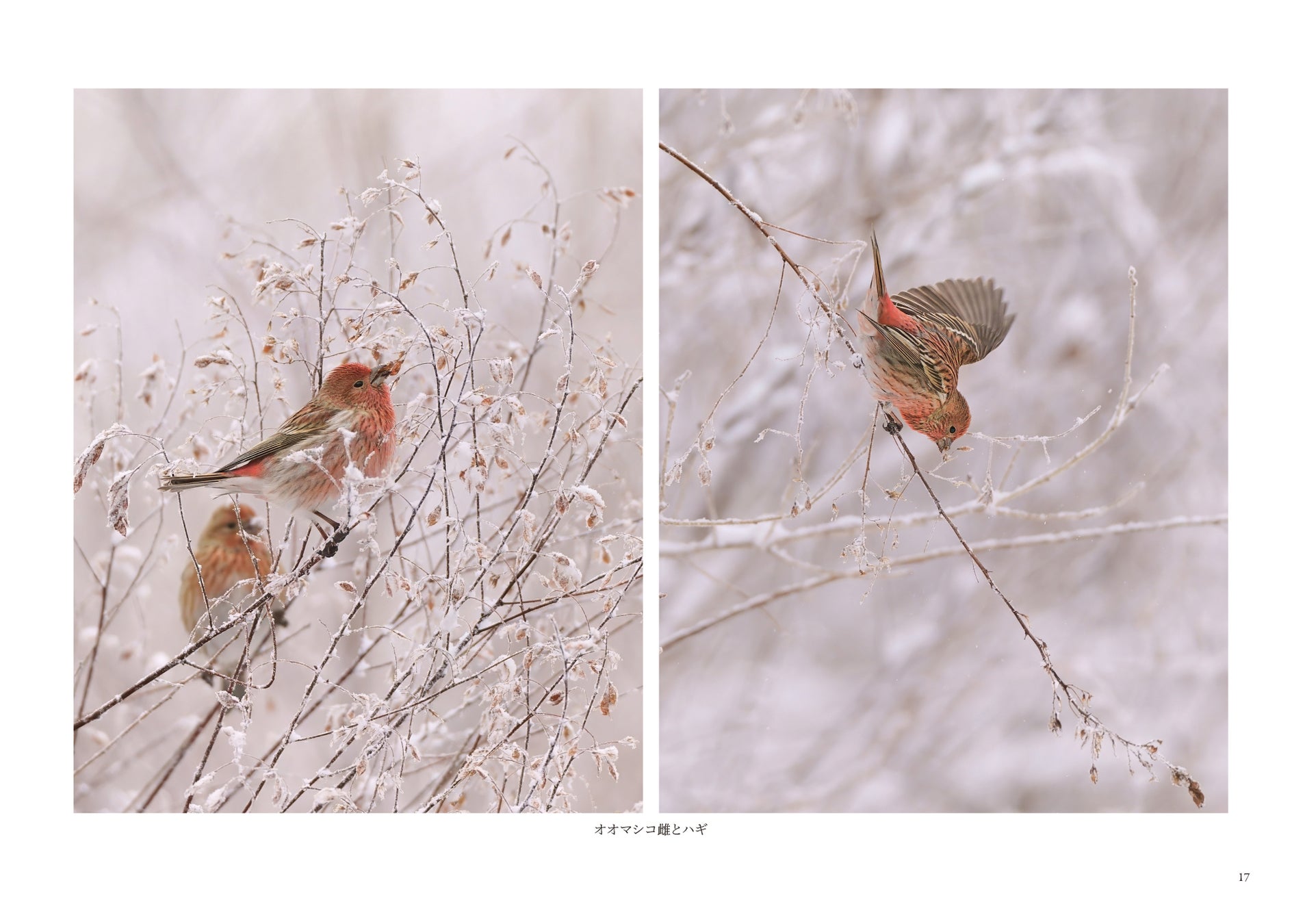 B5横判・フルカラー80ページにわたり、ノゴマ、ムギマキ、オオマシコ、ベニマシコ、コマドリ、コルリ、キビタキ、マミジロキビタキ、コサメビタキ、オジロビタキ、エゾビタキ、ヒレンジャク、サンコウチョウ、ヤマセミ、アカショウビン、ブッポウソウ、コゲラ、アオゲラ、アカハラ、ツグミ、コガラ、ウソ、ジョウビタキといった、日本の野山や水辺に生きる多彩な鳥たちの姿を収録しています。