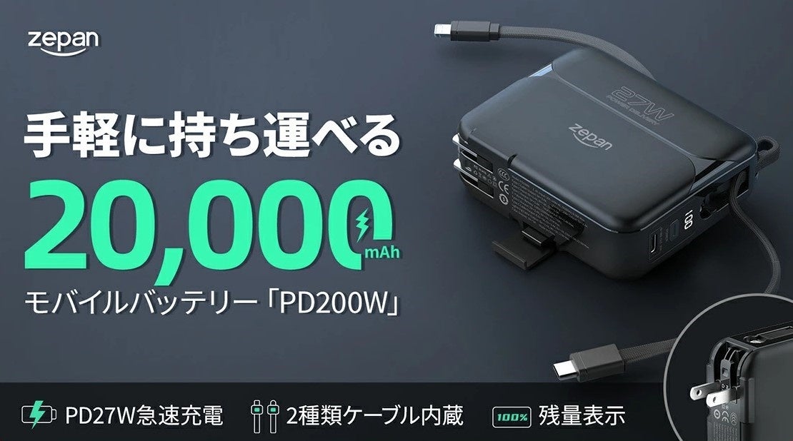 手軽に持ち運べる20,000mAh、モバイルバッテリー「PD200W」楽天市場に初登場