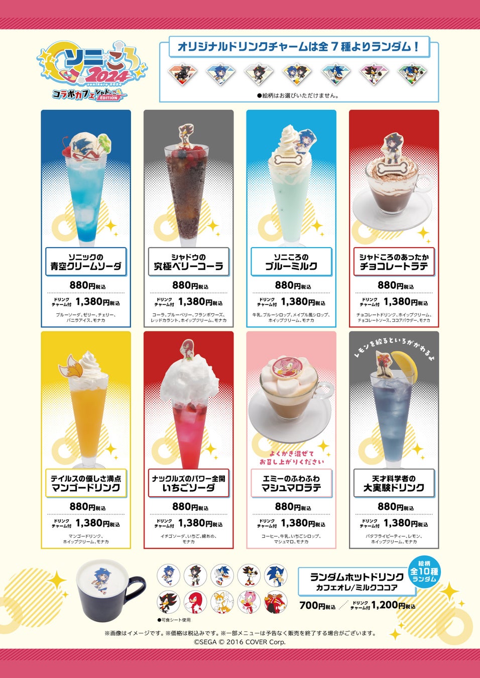 コラボカフェでは、ソニック、シャドウ、戌神ころねさんたちをイメージしたオリジナルコラボメニューをご提供します。ドリンクメニューには、1品につき追加購入としてドリンクチャーム(全7種※ランダム)を1種類付けることが可能です。