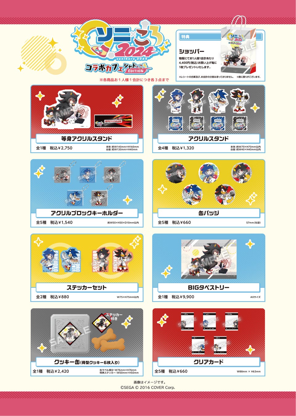 コラボカフェ限定で購入できるコラボグッズも多数ご用意しております。「ソニころ2024 コラボカフェシャドころEDITION」キービジュアルを採用した等身アクリルスタンドやBIGタペストリー、SDイラストが可愛い缶バッジ、クリアカードなどを販売予定です。