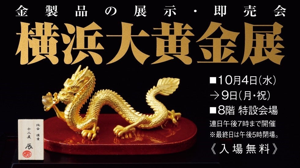 そのような中、横浜高島屋では、金の工芸品の展示や販売をおこなう「大黄金展」を開催いたします。来年の干支である「辰」をモチーフとした置物や、金のぐい呑みや盃、おりんなど1,000点以上の金製品が並ぶほか、今回は新たに大切な方への贈りものにもぴったりな、刻印のできる小判が登場いたします。また、ご自宅に眠っている貴金属類(金・銀・プラチナ製品)の買取りも行います。