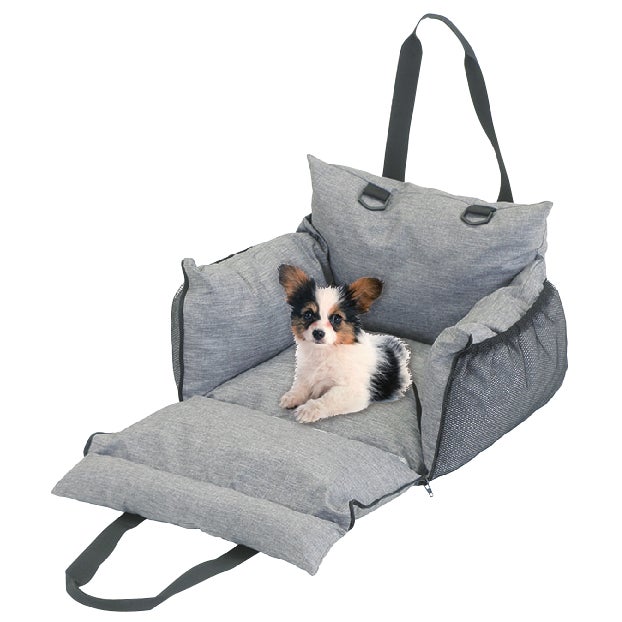 1つ目は「Pet ami ドライブベッド グレー」。カーシートに取り付け、車移動を快適にするペットキャリーです。左右のファスナーを開けるとベッドに早変わりし、ふかふかの中綿で快適な座り心地となっております。併せて室内でもご使用いただくことで、災害発生時にペットにストレスをかけることなく移動が可能です。