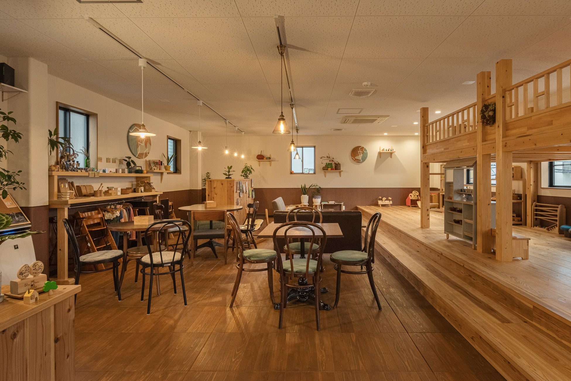 木のぬくもりの中で、大人も子どもも同じ空間でリラックスして過ごせるコミュニティカフェです。キッズスペースとカフェスペースは段差で区切られ、キッズスペースには木組みのロフトが設置されています。