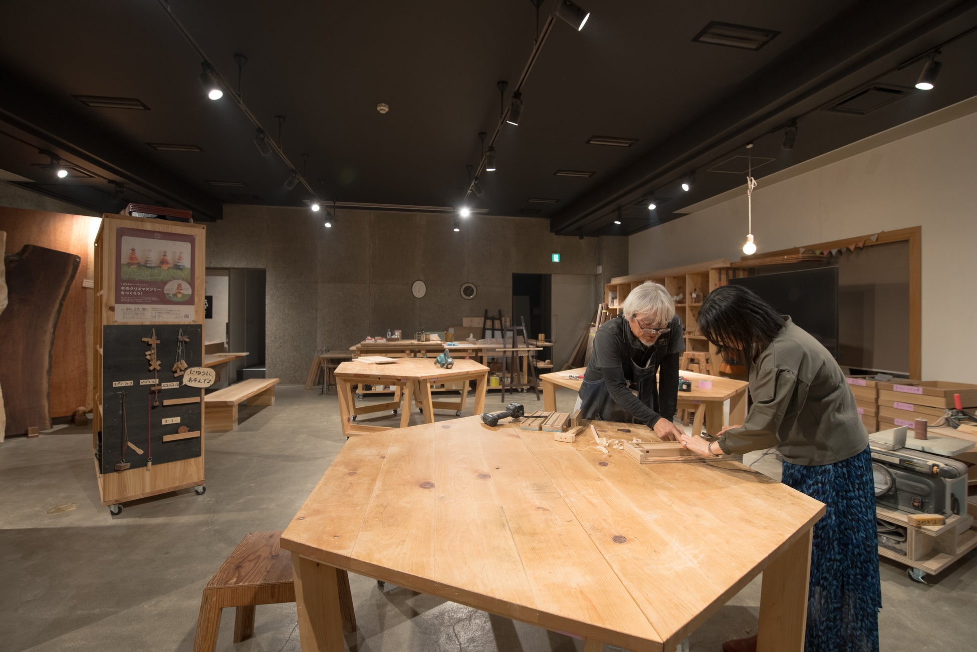 誰もが気軽にDIYができる「まちの作業場」。手ぶらで参加できる常設ワークショップは予約不要。地域の人や観光客が、建築端材を使った作品づくりを楽しんでいます。