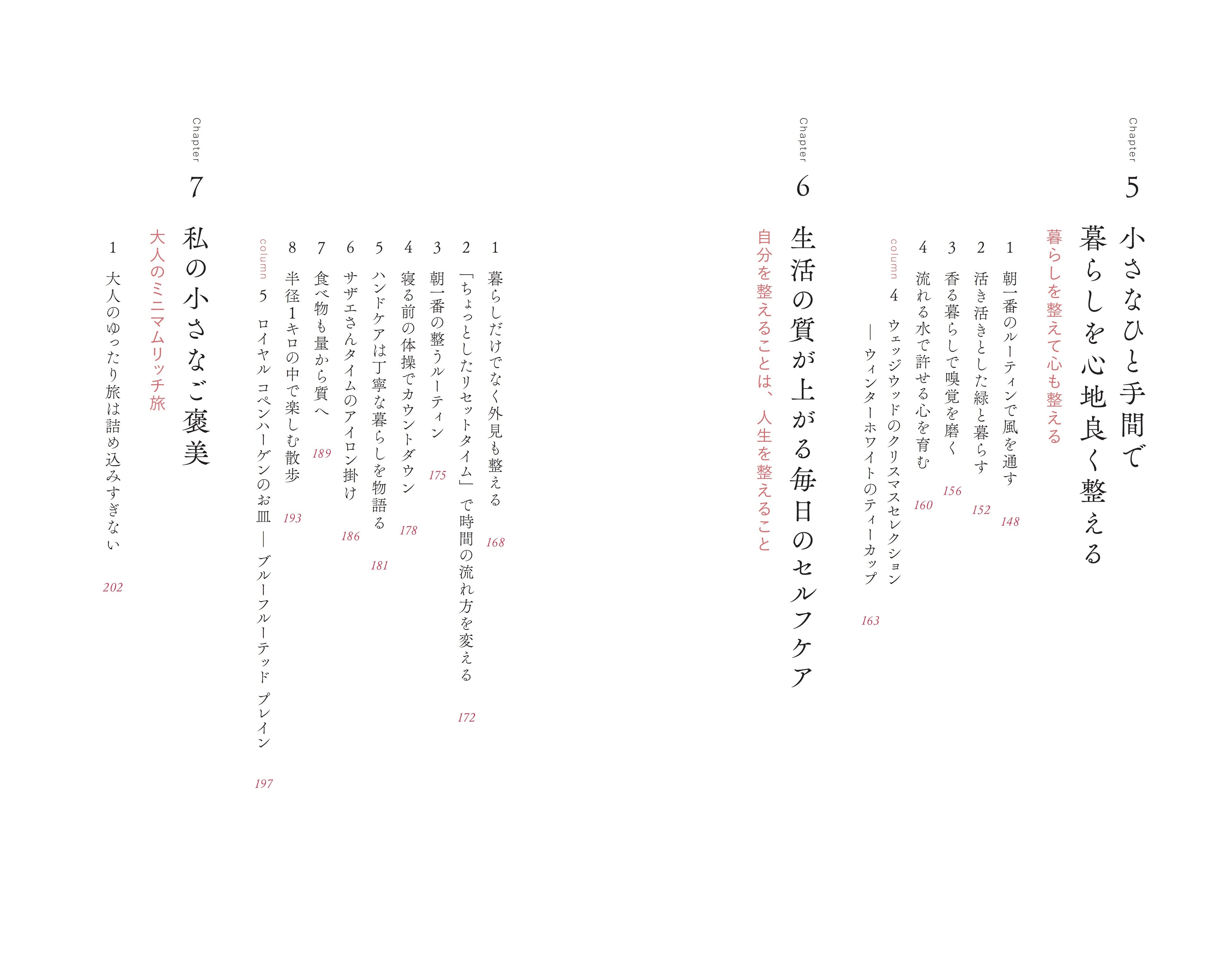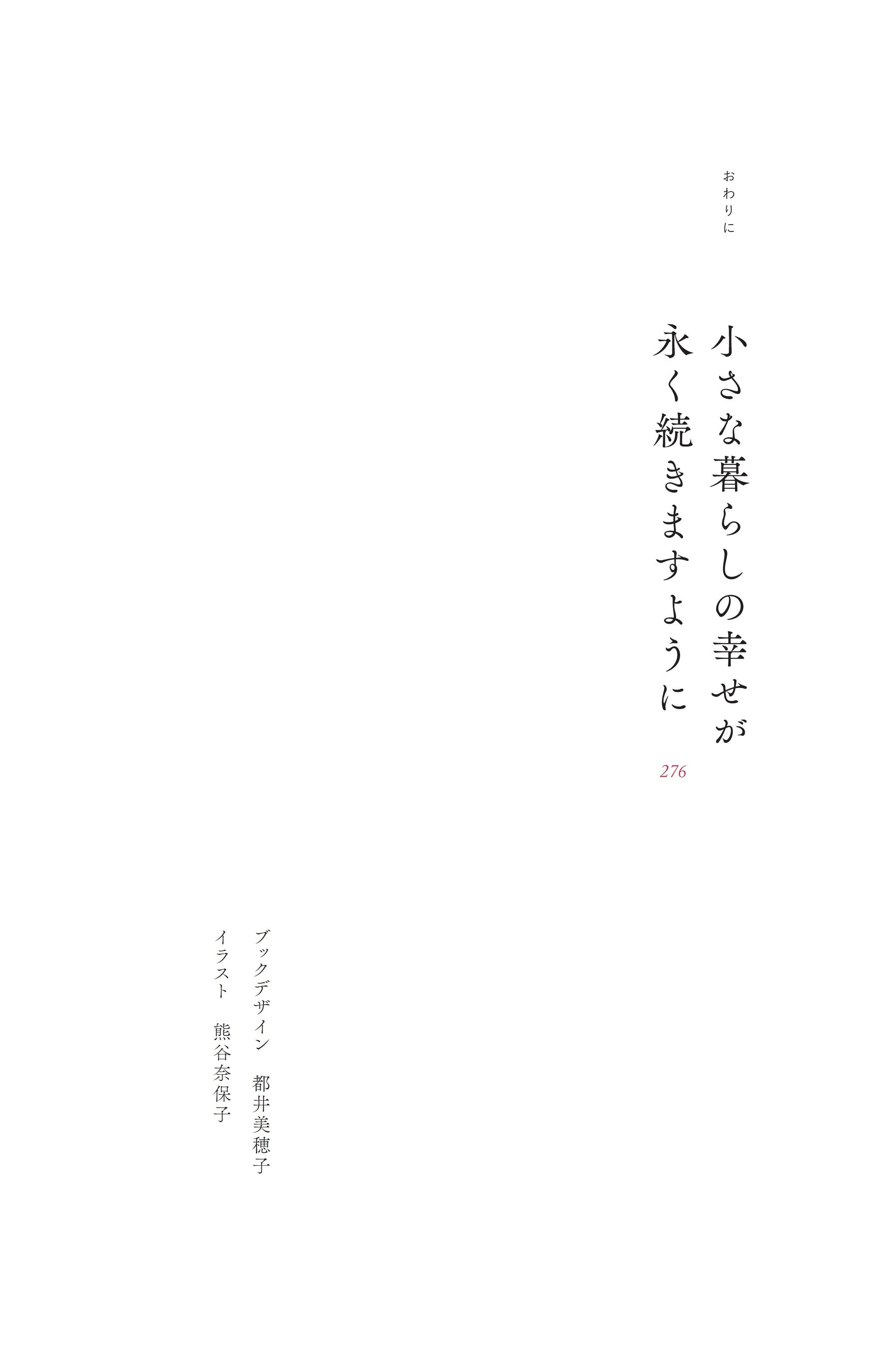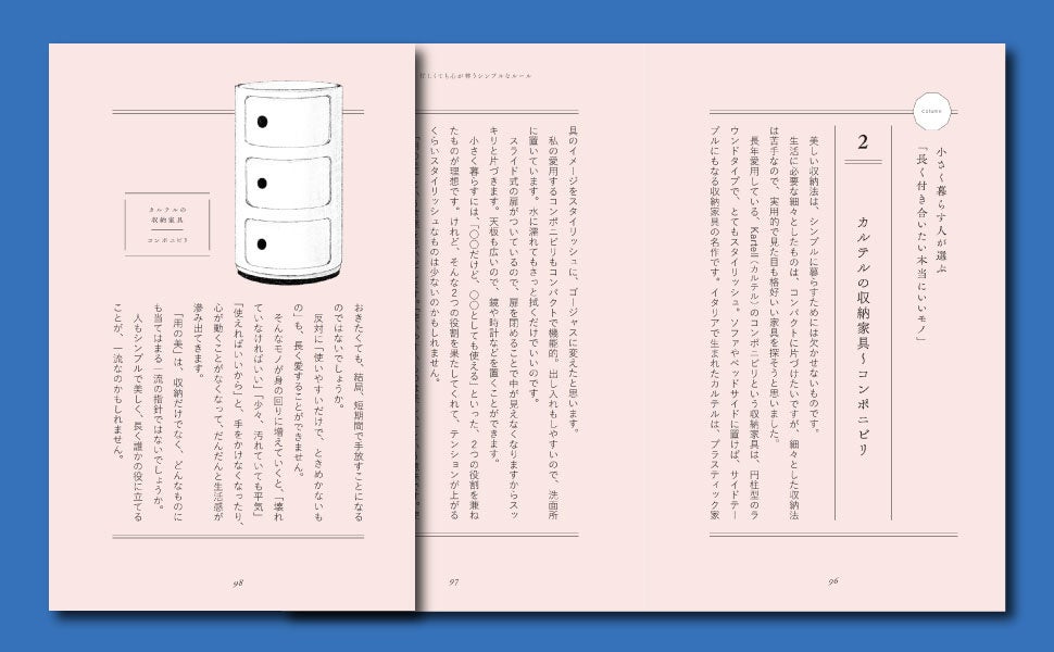 各章末のコラムでは、『小さく暮らす人が選ぶ「長く付き合いたい本当にいいモノ」』を紹介しています。長年著者が愛用してきたアイテムを取り上げました。自分らしく「ミニマムリッチで心豊かな生活」を始めるヒントがつまっています。