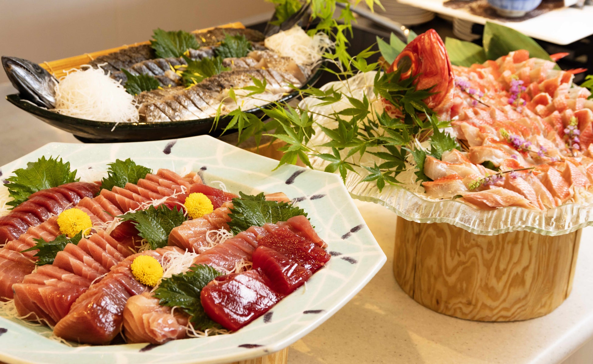 日本で唯一駿河湾でしか獲れない「桜えび」。漁期は年2回で、春漁は3月下旬から6月初旬です。桜えび玉子とじをはじめ、金目鯛の刺身や煮付けの他、ライブキッチンでは、ローストビーフ、握り鮨、揚げたての天婦羅などご用意します。