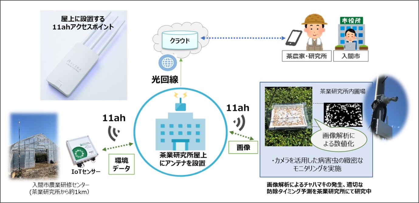 埼玉県茶業研究所(所長:渡辺 寛文)、入間市(市長:杉島 理一郎)、東日本電信電話株式会社 埼玉西支店(支店長:丸山 猛、以下「NTT東日本」)、株式会社NTTアグリテクノロジー(代表取締役社長 酒井 大雅 以下「NTTアグリテクノロジー」)は、入間市金子地区において従来のWi-Fiと比較して広範囲に電波が伝搬し、LPWA※1より高速な通信を可能とする広域Wi-Fi「IEEE 802.11ah(以下、11ah)」※2とIoTセンサーやカメラを活用した茶葉栽培の農業DXの実証実験を開始します。