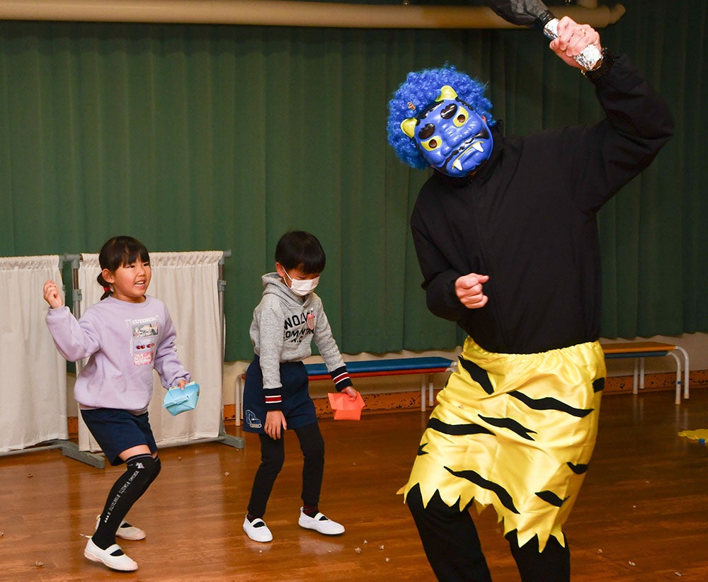 令和7年2月3日(月曜日)、高槻市立玉川幼稚園の4歳児と5歳児9人が節分の豆まきを体験。園児たちは、「襲ってきた鬼の声が怖かったけど、頑張って追い払ったよ」などと喜びの声をあげ、1年の福を呼び込みました。